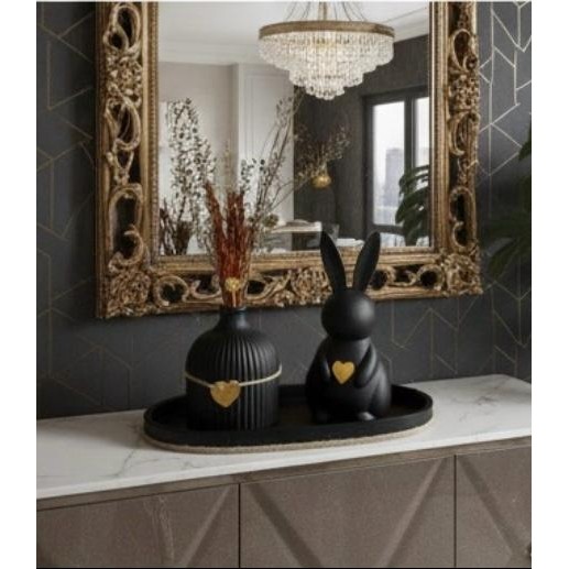 Deixe sua decoração de Páscoa mais sofisticada com este kit moderno e delicado. O conjunto é composto por um coelho decorativo com detalhe em coração dourado, vaso texturizado elegante e bandeja decorativa que valoriza toda a composição. Ideal para mesa posta, aparador, sala, hall de entrada ou escritório. Design minimalista, acabamento refinado e combinação perfeita para ambientes modernos e sofisticados. Produto leve, resistente e feito com excelente qualidade. Não acompanha arranjo seco. Medidas: Coelho 14 cm de altura e 7 cm de largura Vaso 9,5 cm de altura e 7 cm de largura Bandeja 22 cm de comprimento e 9 cm de largura Contém: 1 Coelho decorativo 1 Vaso decorativo 1 Bandeja decorativa
