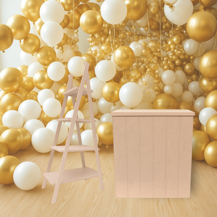 Kit. Decorativo de Escada 4 Andares + Cômoda Mesa Suporte para Festas e Eventos Resistênte e Práticos