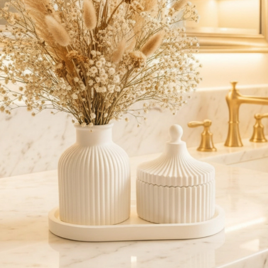 ✨ Transforme Seu Ambiente com Sofisticação e Durabilidade Eleve o padrão da sua decoração com o nosso Kit Decorativo Minimalista de 3 Peças, a escolha perfeita para quem busca a união entre design de luxo e resistência incomparável. Ideal para lavabos, banheiros, penteadeiras e mesas de centro, este conjunto é a peça-chave para um ambiente organizado e elegante. 🛠️ O Diferencial do Cimento Branco Estrutural (NÃO É GESSO!) Este é o nosso maior diferencial. Enquanto a maioria dos produtos decorativos utiliza gesso (material frágil e sensível à umidade), nossas peças são fabricadas com Cimento Branco Estrutural de Alta Performance. Feitas à mão com cimento branco estrutural de alta qualidade, cada peça é única e carrega a beleza da produção artesanal. O design minimalista e atemporal combina perfeitamente com diversos estilos de decoração, trazendo um ar de requinte para qualquer cômodo. ✅ Design Exclusivo: Peças com design canelado e formas orgânicas que são a última tendência em decoração de interiores. ✅ Versatilidade: Use as peças juntas para criar um ponto focal ou separadamente em diferentes ambientes. Perfeito para aparadores, mesas de centro, prateleiras, banheiros e escritórios. ✅ Produto Artesanal: Cada kit é cuidadosamente feito à mão, o que pode resultar em pequenas variações de textura e tonalidade, tornando sua peça verdadeiramente única. ✅ Presente Perfeito: Surpreenda alguém especial com um presente elegante, sofisticado e inesquecível. ATENÇÃO AS MEDIDAS: VASO LISTRADO: 5,5 cm largura x 10,0 cm de altura VASO GARRAFA: 7,0 cm largura x 7,0 comprimento x 10,0 cm de altura PORTA-JÓIA: 8,0 cm largura x10,0 cm de altura BANDEJA OVAL: 9,0 cm de largura x 17,5 cm de comprimento BANDEJA REDONDA: 12,5 cm de largura x 12,5 cm de comprimento 🚚 Envio rápido 📦 Produto bem embalado ⚠️ As flores e outros objetos de cenário NÃO acompanham o produto. As imagens são meramente ilustrativas para inspirar você!