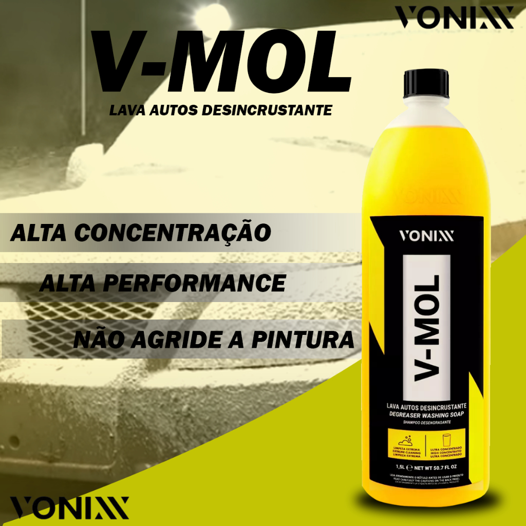 V-MOL SHAMPOO DESENCRUSTANTE 1,5L -DELET LIMPADOR DE PNEUS E BORRACHAS 500ML V-MOL é um lava autos desincrustante com pH levemente básico que não agride a superfície, ideal para lavagem de automóveis, em especial para remoção de sujeiras mais difíceis, como barro e óleo. Diluição: Sujeira leve/manutenção 1:100| Sujeira Media 1:50| Sujeira pesada 1:10 MODO DE USO:1. Diluir o produto na proporção indicada. 2. Iniciar a lavagem com o auxilio de uma luva de microfibra, sempre começando pelas partes superiores do veiculo. 3. Mergulhar a luva na solução e esfregar suavemente ate completar o veiculo. 4. Enxaguar em seguida ate a retirada de todo o produto. 5. Secar o veiculo por completo a fim de evitar manchas. DELET é um limpador de alta performance, formulado exclusivamente para remover sujidade severa em pneus e borrachas, garantindo total limpeza, devolvendo originalidade e sem deixar aspecto acinzentado. Essa limpeza ajudara a melhorar a performance dos produtos para condicionar os pneus e borrachas. MODO DE USAR: 1-Com o pneu ainda seco, pulverizar a espuma do produto em todo o pneu. 2-Deixar o produto agir de 30 a 60 segundos, ou ate observar uma mudança de coloração da espuma de branco para cinza, marrom ou preto. Essa mudança de coloração é um indicador de presença de muita impregnação de sujeira. 3-Fazer a esfregação por completo utilizando uma escova para limpeza de pneus. 4-Fazer o enxague com um jato d´agua. 5-Se necessário repita a operação. - Não nos responsabilizamos pela má instalação ou mau uso do produto, faça a instalação com profissionais especializados. - Atenção: As compras realizadas em nome de Pessoa Jurídica estão sujeitas a cobrança de ICMS, conforme Protocolo ICMS 41, de 4 de Abril de 2008. Caso você tenha dúvidas sobre o percentual a ser aplicado, consulte a Cláusula Segunda, §1° do referido Protocolo. - Em caso de dúvidas use o campo de Perguntas. Fotos meramente Ilustrativas. Caso tenha dúvidas quanto a utilização deste produto, favor consulte-nos pelo campo de perguntas. CÓD. REFERÊNCIA: 015805