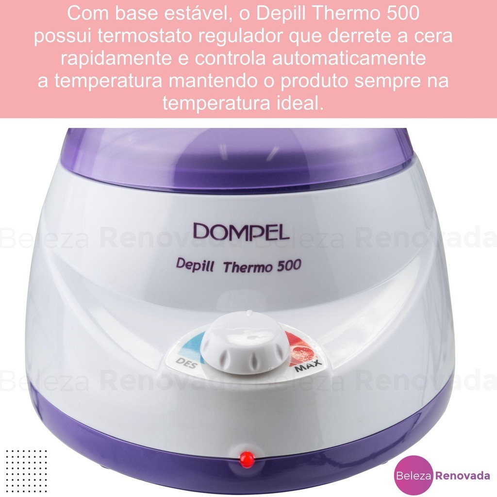 A linha de depilação da Dompel oferece modernidade, conforto e segurança aos profissionais e clientes nos cuidados com o corpo. Com base estável, o Depill Thermo 500 possui termostato regulador que derrete a cera rapidamente e controla automaticamente a temperatura mantendo o produto sempre na temperatura ideal. Possui Resistência Blindada. Seu design exclusivo valoriza a beleza do ambiente, traz muita praticidade e facilidade de limpeza. Dica: utilizado em conjunto com o refil extra você otimiza a sessão de depilação. Potência: 35W – 40W; Tensão: Bivolt automático