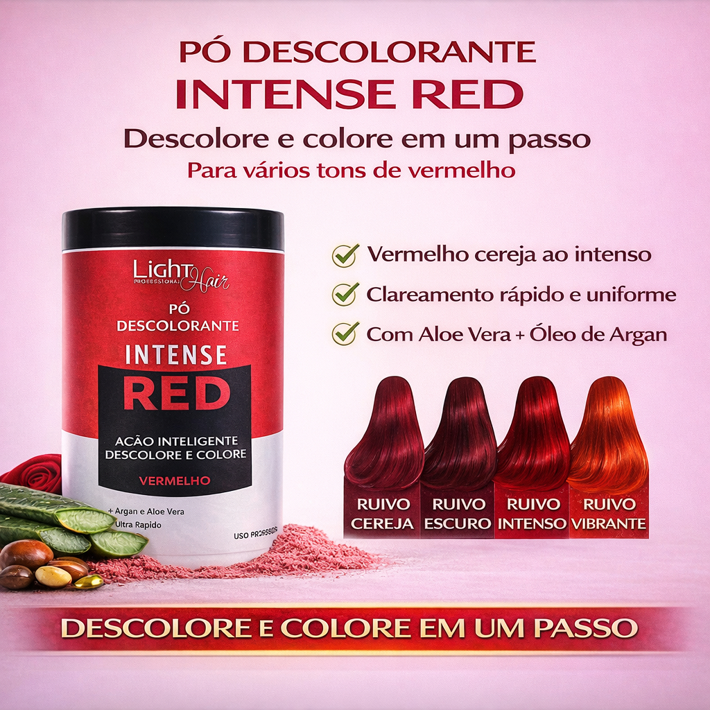 Kit Pó Descolorante Vermelho Intense Red + Água Oxigenada 30 Vol Light Hair Transforme o visual com ruivos intensos, vibrantes e uniformes com o kit profissional da Light Hair, que descolore e colore em um único passo, trazendo praticidade, performance e resultado de salão. Ideal para profissionais e para quem busca um ruivo poderoso em casa, com menos danos e mais brilho. 🔥 Principais Benefícios ✔ Descolore e colore ao mesmo tempo ✔ Cria tons de vermelho do cereja ao ruivo intenso ✔ Clareamento rápido e eficiente ✔ Cor vibrante e uniforme desde a primeira aplicação ✔ Menos ressecamento durante o processo ✔ Fórmula com Aloe Vera + Óleo de Argan ✔ Brilho, maciez e toque sedoso ✔ Resultado profissional 🧪 O que vem no kit 📦 1 Pó Descolorante Vermelho Intense Red Light Hair 📦 1 Água Oxigenada OX 30 Vol Light Hair (900ml) 💎 Indicação Mechas vermelhas e ruivas Ruivo global Efeitos profissionais Cabelos naturais ou coloridos Técnicas de clareamento com cor 🇧🇷 Qualidade Light Hair ✔ Indústria brasileira desde 2007 ✔ Uso profissional ✔ Tecnologia exclusiva Light Hair ✔ Mais de 1.000 clientes satisfeitos ✔ Produto original e enviado direto da fábrica pó descolorante vermelho, ruivo intenso, descolorante com cor, kit ruivo, ox 30 volumes, água oxigenada profissional, descolorante light hair, pó descolorante profissional, ruivo vibrante, mechas vermelhas, descoloração com cor