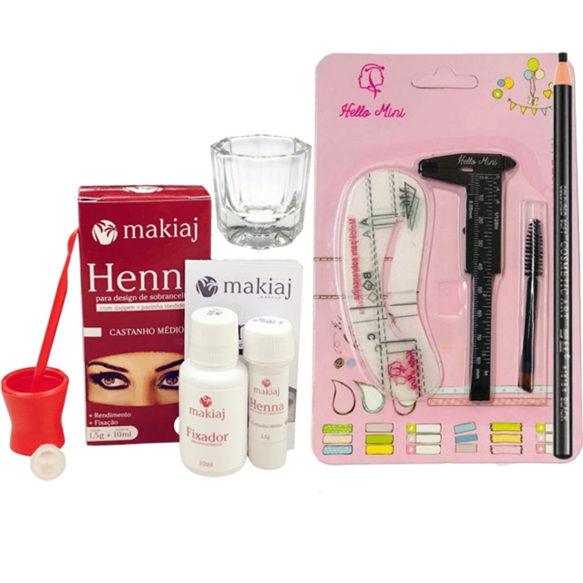 Kit Designer Sobrancelha Henna Makiaj Pincel Duplo Lapis Dermatografico Paquímetro Dappen 6 Moldes