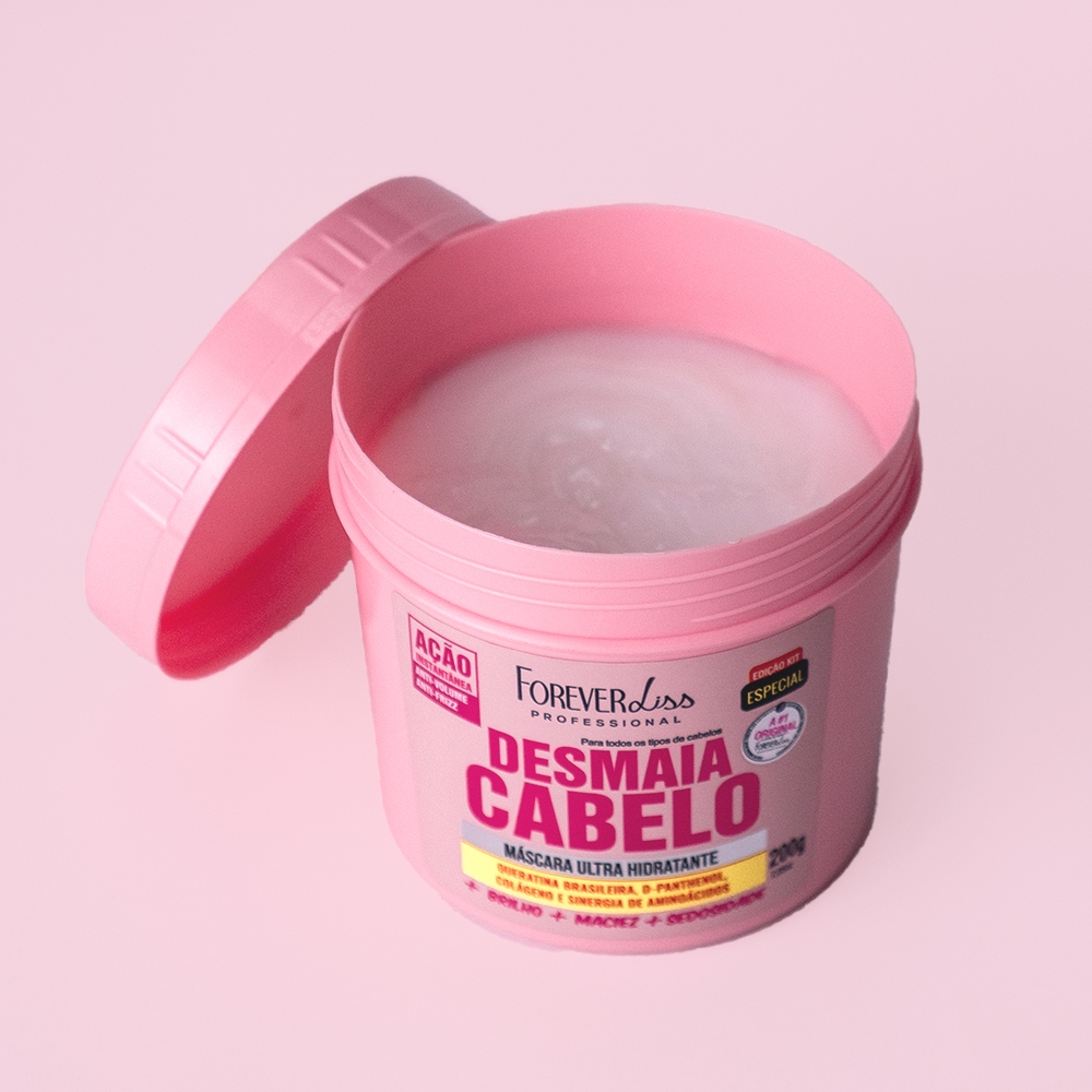 Este kit é composto por 5 produtos, iniciando a aplicação pelo Shampoo Desmaia Cabelo. Ele promove uma limpeza suave dos cabelos, auxiliando no tratamento dos fios porosos. A Máscara Desmaia Cabelo Forever Liss é campeã na preferência das mulheres, pois devido a seus compostos como Queratina Brasileira, D’Pantenol, Colágeno e Sinergia de Aminoácidos, tem alto poder hidratante e reparador. O Condicionador Desmaia Cabelo tem a função de prolongar a hidratação, mantendo os cabelos bonitos e bem cuidados por mais tempo. Para uma ação desembaraçante eficaz, proteção térmica e fios mais leves, o Leave-in Desmaia Cabelo é um poderoso aliado. Para finalizar o tratamento, o Sérum Desmaia Cabelo, rico em silicones multifuncionais, ceramidas e polímeros, forma uma camada protetora que protege os fios do calor do secador e da chapinha, realçando o brilho e a beleza dos seus cabelos. Indicação: Indicado para todos os tipos de cabelos, principalmente os ressecados, com frizz e volume em excesso. Modo de uso: 01. Comece a lavagem com o Shampoo Desmaia Cabelo massageando a primeira vez, para retirar resíduos que não permitem a completa formação da espuma; 02. Enxágue e repita a aplicação do Shampoo Desmaia Cabelo, em movimentos circulares suaves, com as pontas dos dedos no couro cabeludo. Aguarde cerca de 3 minutos para que o produto possa penetrar nos cabelos; 03. Enxágue bastante até remover completamente o shampoo; 04. Após lavar, aplique a Máscara Desmaia Cabelo nos fios ainda úmidos, espalhando em todo o comprimento; 05. Enluve mecha a mecha; 06. Deixar agir por 5 minutos; 07. Enxaguar normalmente até remover o produto por completo; 08. Aplique o Condicionador Forever Liss nos cabelos ainda molhados, massageando mecha por mecha; 09. Deixe agir por 2 minutos; 10. Enxague os cabelos e retire o excesso de água; 11. Coloque uma quantidade adequada do Leave-in Desmaia Cabelo na palma da mão e aplique sobre os cabelos úmidos; 12. Massageie mecha a mecha ou penteie os cabelos; 13. Aplique algumas gotas do Sérum Desmaia Cabelo sobre a palma da mão, espalhando uniformemente sobre os fios; 14. Deixe secar naturalmente, ou finalize com secador ou prancha. Contém: 01 - Shampoo Desmaia Cabelo 500ml 01 - Máscara Desmaia Cabelo 350g 01 - Condicionador Desmaia Cabelo 300g 01 - Leave-in Desmaia Cabelo 140g 01 - Sérum Desmaia Cabelo 60ml Precauções: Manter em temperatura ambiente, em local seco e ao abrigo de luz. Uso externo adulto. Em caso de contato acidental com os olhos, enxaguar abundantemente. Havendo irritação, suspenda o uso. Caso a irritação persista, procure orientação médica. Não ingerir. Manter fora do alcance de crianças. Principais Dúvidas: 01. Qual o pH dos produtos do Kit Desmaia Cabelo Completo Forever Liss? R. O pH dos produtos são: Shampoo Desmaia Cabelo: 4,5 - 5,5. Máscara Desmaia Cabelo: 3,8 - 5,2. Condicionador Desmaia Cabelo: 3,8 - 5,2. Leave-in: 3,8 - 5,2. Sérum Desmaia Cabelo: 3,8 - 5,2. 02. Gestantes, lactantes e crianças podem utilizar? R. Não há contraindicações, porém em caso de dúvidas o médico deverá ser consultado. 03. Quem tem progressiva pode utilizar o Kit Desmaia Cabelo Completo Forever Liss? R. Sim. Os produtos deste kit são compatíveis com todos os tipos de química. 04. Posso utilizar o Leave-in Desmaia Cabelo antes do secador ou chapinha? R. Sim. Inclusive este produto oferece proteção térmica para evitar os danos causados pelo calor. 05. O Sérum Desmaia Cabelo fornece proteção até quantos graus? R. Este sérum protege os cabelos até a temperatura de 200 ºC.
