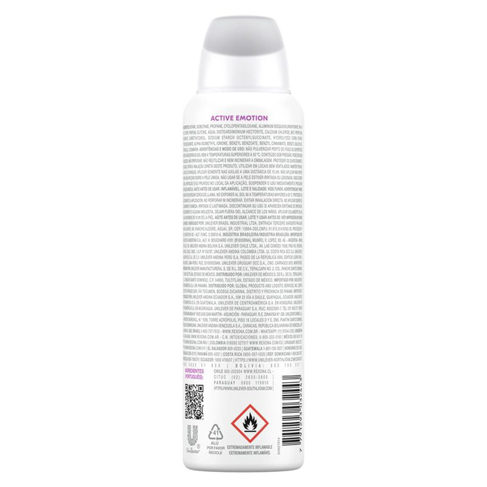 A exclusiva fórmula do Desodorante Aerosol Feminino Rexona Active Emotion garante 72 horas de proteção contra o suor e o mau odor ativado pelo movimento. O desodorante antitranspirante aerosol Active Emotion a mantém seca, refrescada, protegida e confiante para encarar qualquer situação. Desodorante feminino fácil de usar: agite e aplique nas axilas a não menos de 15 cm da pele A fragrância desse antitranspirante contém uma combinação única de notas florais e frutadas, garantindo a sensação de frescor durante o dia inteiro. Esse desodorante antitranspirante não contém álcool* e não afeta a camada de ozônio, sua lata é de alumínio 100% reciclável, feito com energia elétrica 100% renovável. O Desodorante Aerosol Feminino Rexona Active Emotion permite que você fique sempre protegida, não importa o que aconteça. Rexona não te abandona. Mais uma vez Rexona se supera e relança sua linha de desodorantes com uma fórmula inovadora, o Desodorante Aerosol Feminino Rexona Active Emotion combina um novo e exclusivo ativo antitranspirante com a tecnologia de fragrâncias encapsuladas. Esse desodorante antitranspirante aerosol a mantém protegida por até 72 horas, ativado pelo seu movimento e a deixa muito mais confiante para você encarar qualquer desafio. Com o registro de 16 patentes e mais de 300 testes técnicos, está comprovado que essa nova tecnologia antitranspirante entrega um nível de proteção contra o suor como nenhuma outra proposta regular já entregou antes. A nova e exclusiva fórmula de Rexona Active Emotion trabalha com um sistema de partículas menores e mais estáveis que formam uma barreira protetora mais resistente e duradoura contra a transpiração e o mau odor, mantendo você seca, refrescada e protegida a cada novo movimento e por muito mais tempo. Sua fragrância contém uma combinação única de notas florais e frutadas, garantindo a sensação de frescor durante o dia inteiro. A lata usada no desodorante é feita de alumínio 100% reciclável, e o produto é feito com energia elétrica 100% renovável, não contém álcool* e não afeta a camada de ozônio. Experimente também outros produtos da linha de desodorantes aerosol femininos Rexona e se sinta sempre protegida durante qualquer atividade. Por que Rexona não te abandona! *Não contém álcool etílico.