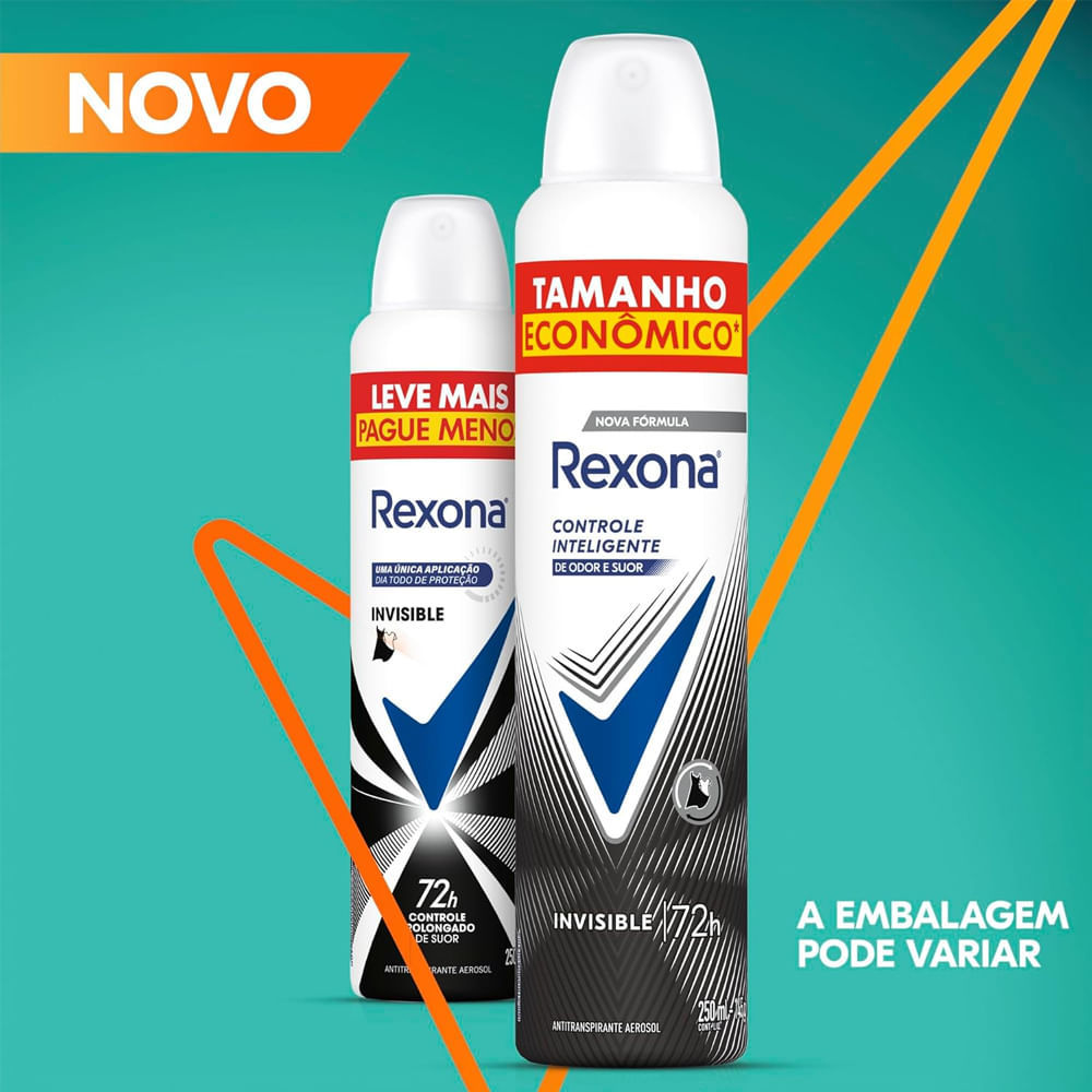 O Desodorante Antitranspirante Aerosol Feminino Rexona Invisible possui nova fórmula: 72 horas de proteção contra a transpiração e o mau odor, ativada pelo movimento. O novo desodorante feminino Rexona responde diretamente ao seu movimento, mantendo você seca, fresca e protegida como nunca. Testado cientificamente e validado por consumidores brasileiros. 84% dos consumidores que experimentaram o produto afirmam que trocariam o seu antitranspirante atual pelo Novo Rexona. A fórmula do Antitranspirante Aerosol Feminino Rexona Invisible é 0% álcool*, e possui tecnologia que protege a sua roupa contra manchas brancas e amarelas. Agite antes de usar. Aplicar o Desodorante Feminino Rexona Invisible somente nas axilas a não menos de 15 cm da pele. Este desodorante antitranspirante não afeta a camada de ozônio, possui lata em alumínio 100% reciclável e é feito com energia elétrica 100% renovável. Mais uma vez Rexona se supera e relança sua linha de desodorantes com uma fórmula inovadora, que combina um novo e exclusivo ativo antitranspirante com a tecnologia de fragrâncias encapsuladas. O resultado? O Desodorante Antitranspirante Aerosol Feminino Rexona Invisible garante 72 horas de proteção ativada pelo seu movimento e muito mais confiança para você encarar qualquer desafio. Com o registro de 16 patentes e mais de 300 testes técnicos, está comprovado que essa nova tecnologia antitranspirante entrega um nível de proteção contra o suor como nenhuma outra proposta regular já entregou antes. A nova e exclusiva fórmula de Rexona Invisible trabalha com um sistema de partículas menores e mais estáveis, que formam uma barreira protetora mais resistente e duradoura contra a transpiração e o mau odor, mantendo você seca, fresca e protegida a cada novo movimento e por muito mais tempo. Este desodorante feminino antitranspirante não afeta a camada de ozônio, possui lata em alumínio 100% reciclável e é feito com energia elétrica 100% renovável. Modo de usar: Agite antes de usar. Aplicar somente nas axilas a não menos de 15 cm da pele. Sua fórmula é 0% álcool*, e possui tecnologia que protege a sua roupa contra manchas brancas e amarelas. Além da nova fórmula, o novo formato de Rexona aerosol 250 ml é mais econômico, onde você leva mais produto e paga menos**. Ele é o formato mais sustentável de Rexona aerosol, com uma embalagem que utiliza 23% menos metal e 41% menos plástico do que a versão de aerossol 150 ml, quando se compara o gasto por tonelada de produto. Por ano, são vendidas muitas toneladas de Rexona aerosol, então essa escolha nos ajuda a dar mais um passo em direção ao que é melhor para o planeta. Por que Rexona não te abandona. *Não contém álcool etílico. **Quando comparado à versão de 150 ml