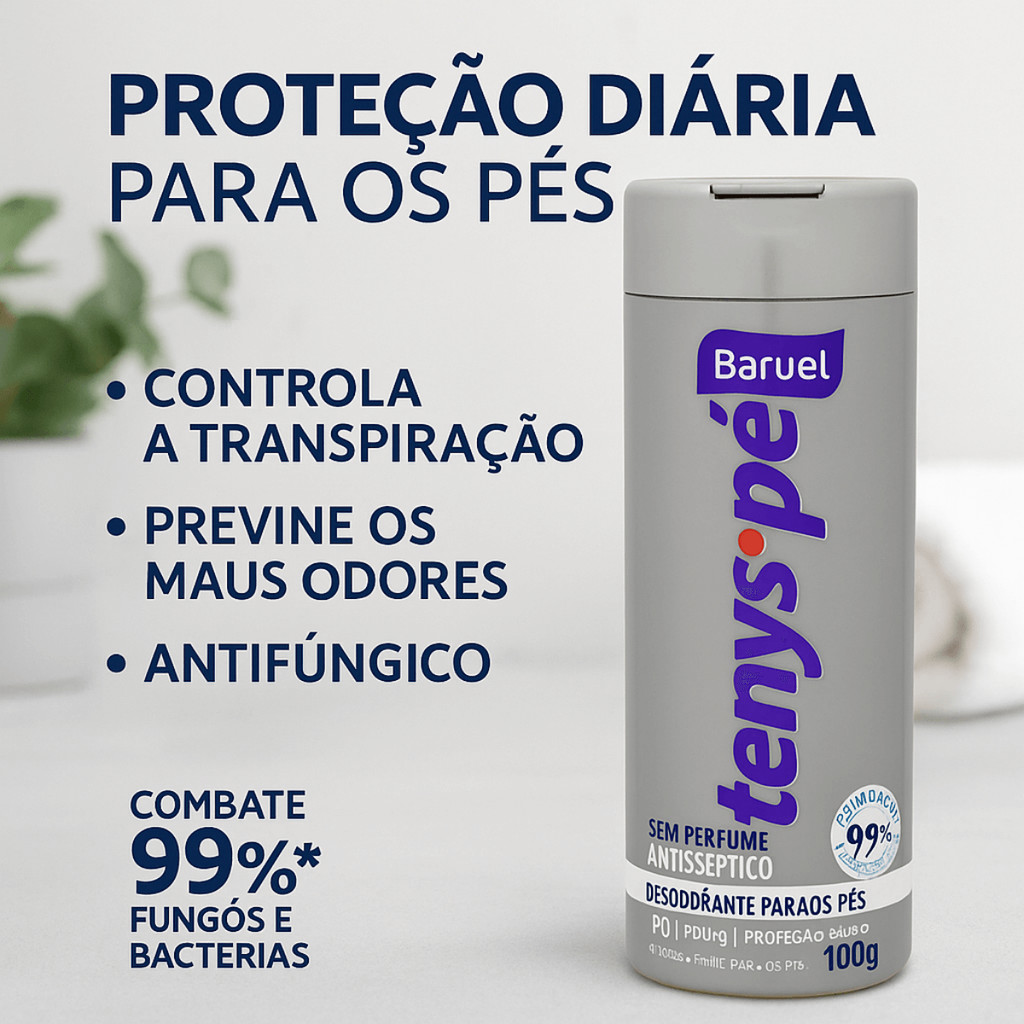 Kit Tenys Pé Baruel Woman – Aerossol 150ml + Pó Sem Perfume 100g Proteção contra mau odor e suor por muito mais tempo. O aerossol garante frescor imediato e ação antibacteriana, enquanto o pó controla a umidade e mantém os pés secos durante todo o dia. Ideal para quem precisa de proteção real e conforto contínuo. Dermatologicamente testado. Por que este kit é perfeito para você? ✔ Dupla proteção: Aerossol + Pó para ação prolongada ✔ Fórmula antimicrobiana – combate bactérias causadoras de mau odor ✔ Pó sem perfume – ideal para quem tem sensibilidade a fragrâncias ✔ Sensação de frescor imediato com o aerossol ✔ Mantém os pés secos o dia inteiro ✔ Dermatologicamente testado – seguro para uso diário ✔ Kit econômico e completo para rotina de cuidados