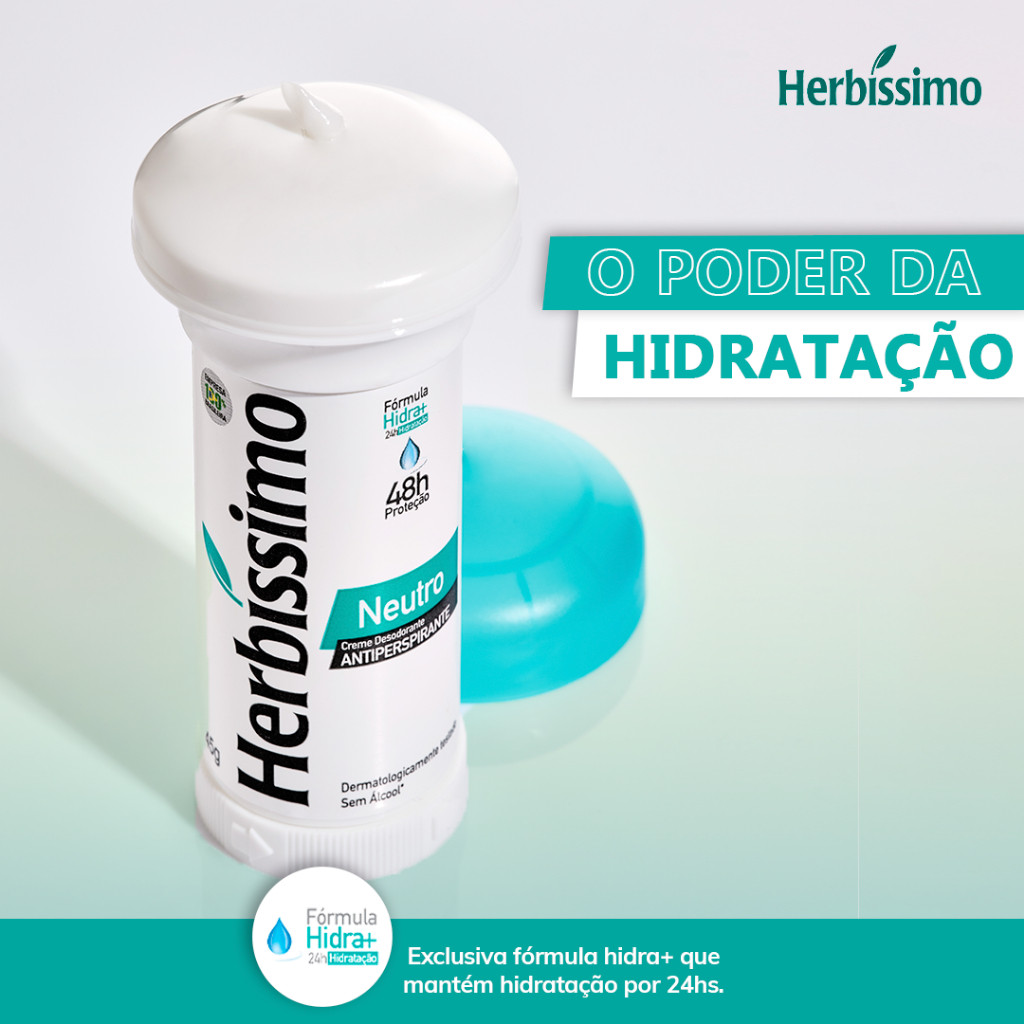 Praticidade com atitude? A gente entrega e ainda eleva o nível. Aplicação sem usar as mãos 48h de proteção contra suor e odor 24h de hidratação evitando o ressecamento da pele Ajuda a minimizar irritações Dermatologicamente testado Livre de álcool etílico Sem corantes Girou, aplicou, acabou o drama. O Herbíssimo Twist é o creme desodorante que entrega proteção poderosíssima sem meleca nas mãos prático, inteligente e zero complicação. ATIVE SEU MODO PODEROSÍSSIMO PIRAMIDE OLFATIVA Sem notas olfativas MODO DE USAR: Girou, aplicou… pronto: modo poderosíssimo ativado e sem sujar as mãos! Gire a base do stick (seguindo as setas demarcadas na embalagem) até liberar o creme. Primeiro uso? vamos láh é preciso girar algumas vezes... demora um pouquinho. Aplique diretamente nas axilas limpas e secas Espalhe com o próprio aplicador suavemente (sim, zero mãos envolvidas) Use só o necessário sem exagero! Aguarde alguns segundos para secagem antes de se vestir Resultado? Axilas protegidas, hidratadas e com performance que segura o suor mesmoooo sem drama e sem meleca. PRECAUÇÕES: Axila é o território. Nada de sair passando por aí. Se a pele estiver irritada ou machucada, melhor dar um tempo, combinado? Deu ruim tipo coceira ou irritação? Pausa tudo na hora e procure orientação médica. E, não se esqueça! mantenha fora do alcance das crianças. COMPOSIÇÃO: Aqua, Aluminum Chlorohydrate, Cetyl Alcohol, Glycerin, Cetearyl Alcohol, Glyceryl Stearate, Ceteareth-20, Paraffinum Liquidum, Helianthus Annuus Seed Oil, Propylene Glycol, Methylparaben, Disodium EDTA, Pentaerythrityl Tetra-Di-T-Butyl Hydroxyhydrocinnamate, Propylparaben, Stearyl Alcohol, Myristyl Alcohol, Methylpropanediol, Polysorbate 80, Caesalpinia Spinosa Gum, Gluconolactone, *4-Terpineol, Potassium Sorbate, Sodium Benzoate, Calcium Gluconate, *Salix Alba Bark Extract.