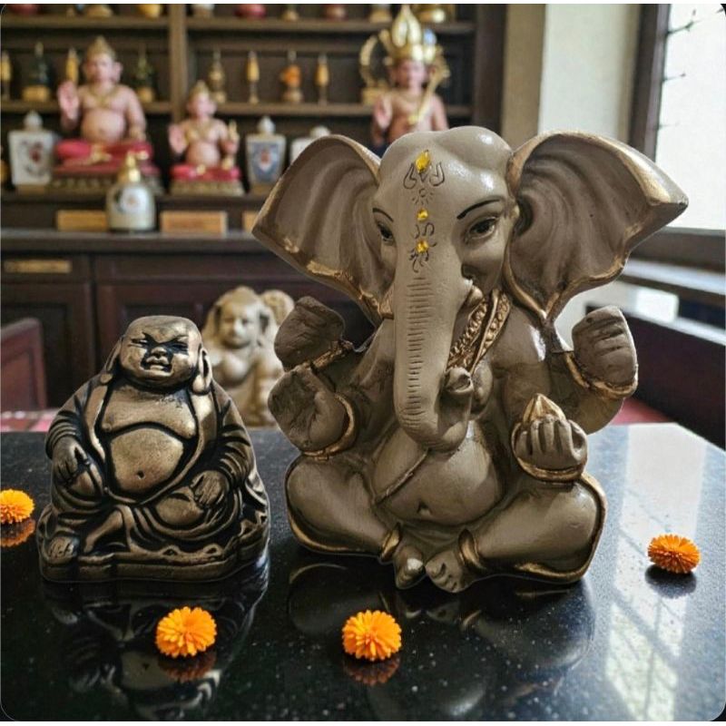 Kit Decorativo: Deus Ganesha Pequeno + Mini Buda ✨ Lindo kit decorativo composto por 1 Deus Ganesha pequeno e 1 Mini Buda, ideal para trazer harmonia, proteção e boas energias ao ambiente. 🕉️ Ganesha – símbolo de prosperidade, sabedoria e remoção de obstáculos 🧘 Buda – representa paz, equilíbrio e serenidade 📏 Tamanho: mini Buda 8 cm / 13 cm de altura Ganesha 🎁 Ideal para: decoração, altar, presente especial ou ambiente zen 🏠 Uso: casa, escritório, consultório ou espaço espiritual Produto delicado, bem acabado e cheio de significado.