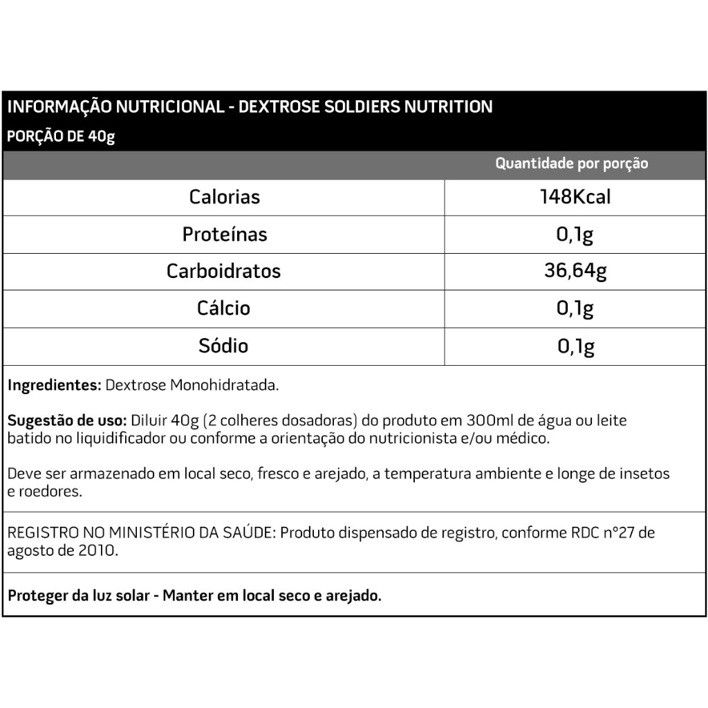 Kit: Dextrose 1Kg + Creatina Monohidratada 600g - 100% Puro Importado - Soldiers Nutrition ESTE KIT CONTÉM OS SEGUINTES ITENS: - Dextrose 1Kg - Creatina Monohidratada 600g Creatina Monohidratada 600g - 100% Pura Importada - Soldiers Nutrition Acompanha Colher Dosadora 3g BENEFÍCIOS DA CREATINA: - Aumenta a capacidade do músculo de gerar força; - Aumento de massa magra; - Aumento da capacidade de treinamento; - Previne o catabolismo muscular; A creatina é um derivado de aminoácidos obtida através da dieta de síntese por nosso próprio organismo. Ela está presente essencialmente no músculo e auxilia na manutenção dos níveis de energia durante períodos breves de exercício intenso. Ou seja, sua função é crucial nos treinos com muito peso na busca pelo ganho de massa. Dextrose 1Kg - 100% Puro Importado - Soldiers Nutrition BENEFÍCIOS DA DEXTROSE: - Fonte de energia; - Intensidade nos exercícios; - Auxilia no ganho de massa muscular; - Proporciona melhor desempenho do treino. A dextrose é uma glicose que atua como uma fonte de energia para o corpo, assim seus treinos serão mais intensos e com possibilidade de melhore desempenho, consequentemente com o aumento de energia e do alto desempenho ela irá contribuir para o ganho de massa muscular. SOMOS FABRICANTES, PRODUTO DIRETO DA FÁBRICA PARA VOCÊ COM TOTAL GARANTIA DE QUALIDADE ANVISA: Registro ISENTO conforme resolução RDC 27 de 06 de agosto de 2010 anexo I. Registro ISENTO conforme resolução RDC 240/2018.