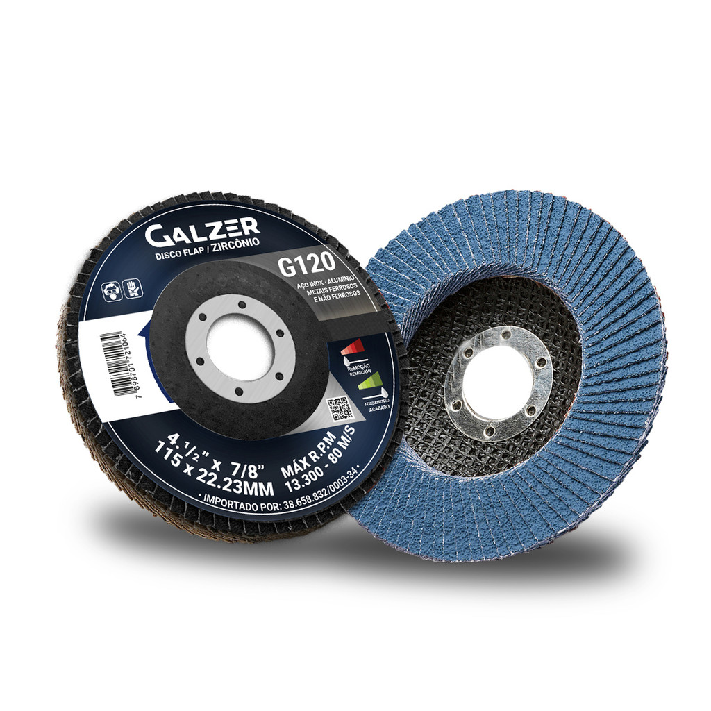 DISCO FLAP 4.1/2" x 7/8" GRÃO 120 ZIRCONIO ___________________________________________________ DETALHES DO PRODUTO: CARACTERÍSTICAS: - Aletas de lixa com costado de tecido - Base para costado em fibra - Grão de zircônio VANTAGENS: - Agilidade, realizando o desbaste e o acabamento simultaneamente - Remove o material com excelente qualidade no acabamento - Estabilidade, proporciona menor vibração - Menos Ruído - Melhor aproveitamento - Aumento do rendimento INDICAÇÕES DE USO: - Desbaste de Soldas - Homogeneização de Superfícies - Rebarbação - Eliminação de Corrosão - Acabamento ESPECIFICAÇÕES TÉCNICAS: - Diâmetro do disco: 115 mm (4.1/2”) - Diâmetro do furo: 22,23 mm (7/8”) - Grão: 120 - Lixa: Zircônio - Costado Tecido com base de plástico - Velocidade: 13.300 RPM - 80 m/s GARANTIA DE 3 MESES CONTEÚDO DA EMBALAGEM: 10 - DISCOS FLAP 115MM 4.1/2x7/8 GRÃO 120 - GALZER