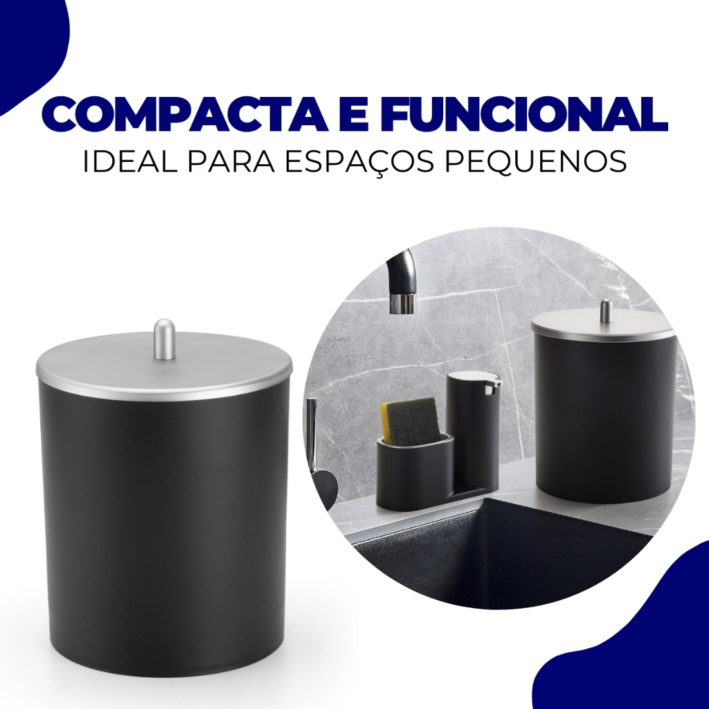 Kit Dispenser Detergente e Esponja Lixeira Luxo Pia Cozinha Preto/ Prata Arthi
