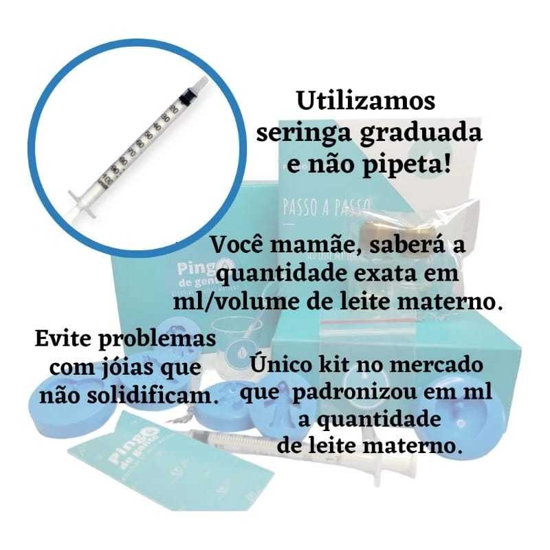 Kit DIY Joia de Leite Materno 2 PINGENTES + Medalha Nome Bebê em Aço Inoxidável Hipoalergênico KIT DIY – FAZ 2 PINGENTES DE LEITE Utilizamos o Método DIY (Do It Yourself) ou seja, Faça Você Mesmo!! Sabemos que a fase da amamentação nem sempre é muito fácil no início não é mesmo?! Mas se torna um ato prazeroso onde se cria um elo entre mãe & bebê. Para eternizarmos esse vínculo criamos o Kit da Pingo de Gente. Buscamos que cada mamãe seja capaz de criar a sua própria jóia, utilizando o principal ingrediente, seu Leite Materno, na confecção! Sua jóia será única! O Kit contêm: • Uma Medalha Nome Bebê gravado a laser. - 1 Guia Passo a passo para confecção. (Poderá ser impresso ou digital); - 1 Par de luvas; - 1 Lixa; - 1 Mexedor de solução; - 2 Elos/ Base de pingente Folheados (Ouro 18k ou Prata 1000 ou Ouro branco) - 1 Seringa para coleta de leite materno; - 2 Moldes (vê as combinações em variações) - 1 Solução A (Soluções com proteção UV). - 1 Solução B; - 1 Frasco C. APÓS A COMPRA, ENVIAR NOME VIA CHAT PARA GRAVAÇÃO. Seu Leite Materno é uma Jóia Rara!!!!! Considerações: A coloração dos moldes e caixa pode sofrer alterações; Damos suporte via chat na confecção; Não acompanha corrente; Pingo de Gente!
