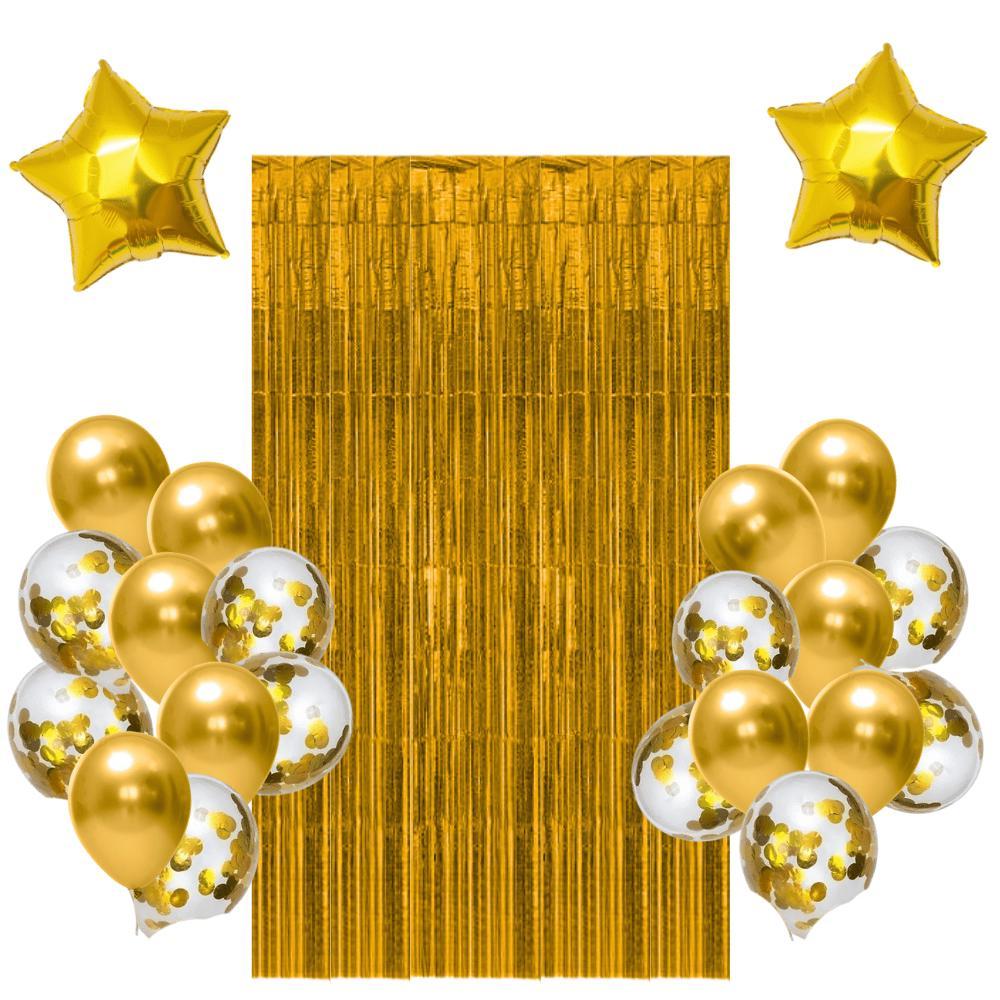Kit Dourado Feliz Aniversário + Balões Decorativos + 2 Cortinas para Festa Perfeita