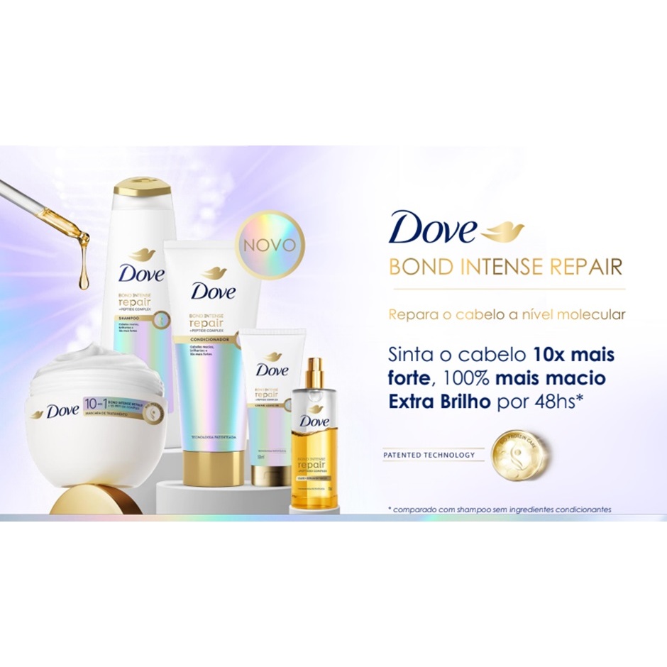 Kit Bond Intense Repair A Linha Dove Bond Intense Repair possui a nova tecnologia patenteada Bio-Protein Care, proteína 100% compatível com a estrutura natural do cabelo, que age em harmonia com a biologia capilar e reverte os sinais do dano; e Peptídeo Complex, microcomponentes da proteína que conseguem atingir as camadas mais internas da fibra para restaurar as ligações rompidas a nível molecular. Juntos, reparam os sinais de dano dos fios a nível molecular desde o primeiro uso. Focada em nutrição para cabelo. Modo de Uso Shampoo: Massageie sobre os cabelos molhados e enxágue. Aplique novamente se necessário. Para melhores resultados, experimente também outros produtos para cabelos Dove Bond Intense Repair. Condicionador: Após o uso do shampoo, aplique sobre todo o comprimento dos fios, até as pontas. Deixe agir por um minuto e enxágue. NÃO DEIXE DEE COMPRAR OS DEMAIS ITENS DA LINHA Máscara de Tratamento: Aplique nos fios até a ponta. Deixe agir por um minuto. Enxágue abundantemente. Creme Leave-In: Aplique do meio as pontas, após a lavagem e penteie. Sem enxágue. Uso diário. Óleo + Sérum Bifásico: Aplique direto no cabelo úmido ou seco, ou nas mãos e espalhe em todo o comprimento.