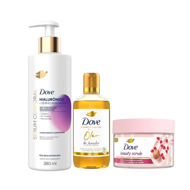 Kit Dove Sérum Hidratante Corporal Hialurônico 380ml + Óleo De Banho 240ml + Esfoliante Corporal Beauty Scrub Romã 280g