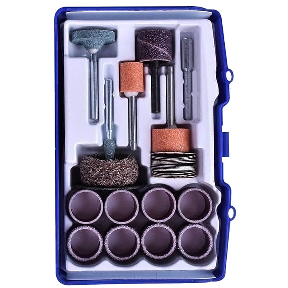 Kit De Acessórios De Micro retifica Para Cortar, Esmerilhar, Gravar e Lixar - 31 Pecas (Modelo 727) Vantagens: - O Kit/Set Dremel e o kit ideal para quem quer cortar, esmerilhar e lixar madeira, PVC, metal, pedra, vidro com as micro retificas Dremel; - O estojo plástico com tampa transparente e bandeja removível permite armazenar e organizar os acessórios além disso ele pode ficar em pé ou pendurado na parede com um gancho; - O kit consiste em pedras de esmerilhar de oxido de alumínio, pedras de esmerilhar de carbeto de silício, disco de corte reforçado com fibra de vidro, discos de lixa, tubo de lixa, discos abrasivos de grão grosso para polimento, ponta para gravar e esmerilhar, EZ Lock e mandril; - O sistema de troca rápida e fácil de acessórios EZ Lock e patenteado e faz com que a troca seja 6 vezes mais rápida do que usar um mandril convencional; - Uso com 6 meses de Garantia Dremel. Dados Técnicos: - Marca: Dremel; - Modelo: 26150727AB; - Aplicações: Cortar, Esmerilhar, Gravar e Lixar; - Quantidade de Itens: 31 Pecas; - Compatível: Dremel 3000, 4000 e 8220; - Dimensões (C x L x A): 8,89 x 4,98 x 14,78 cm; - Peso: 0,130kg. Itens Inclusos: - 1 estojo plástico; - 1 disco reforçado de corte 31,8mm para metal (modelo 426); - 1 pedra formato quadrada para esmerilhar 15,9mm para metal (modelo 8193); - 1 pedra formato pera para esmerilhar 4,8mm para vidro, pedra, cerâmica, alumínio e cobre e gravar em vidro (modelo 84922); - 1 pedra formato disco para esmerilhar 19,8mm para vidro, pedra, cerâmica, alumínio e cobre (modelo 85422); - 1 pedra formato quadrada para esmerilhar 9,5mm para metal (modelo 932); - 1 haste para lixar 12,7mm com tubo de lixa de grão grosso para madeira, fibra de vidro, plástico e EVA (modelo 407); - 4 tubos de lixa 12,7mm de grão grosso para madeira, fibra de vidro, plástico e EVA (modelo 408); - 15 discos de lixa de 19,1mm de grão médio para madeira e remoção de pintura (modelo 412); - 4 tubos de lixa de 12,7mm de grão médio para madeira, fibra de vidro, plástico e EVA (modelo 432); - 1 disco abrasivo para acabamento de grão grosso para metal, vidro, madeira, alumínio e plástico - sistema EZ Lock troca rápida (modelo 511E); - 1 haste para discos (modelo 402).