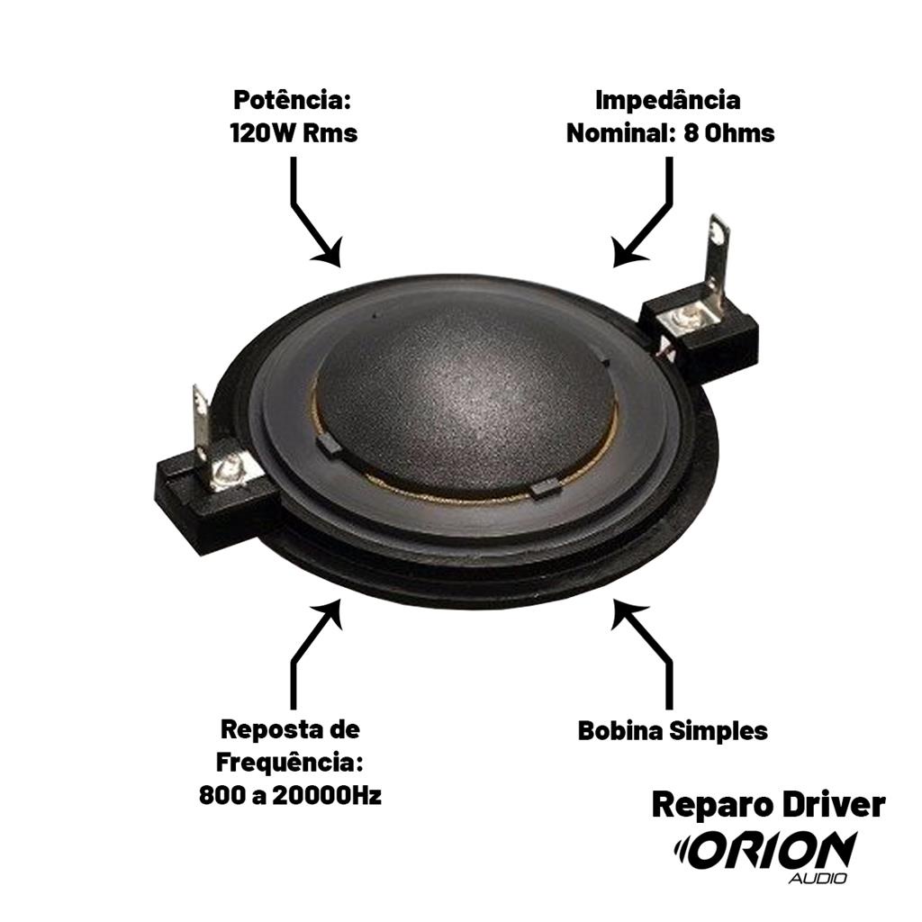 Mais de 15 anos de experiencia no mercado com os melhores produtos e o melhor atendimento! DRIVER 120W RMS + REPARO DRIVER ORION Driver fenolico de 120W de potencia RMS, perfeito para destacar os sons medios, como vozes, agregando mais qualidade e definicao sonora para o seu projeto de som. Especificacoes Tecnicas: Marca: Orion Potencia RMS: 120 Wrms Impedancia Nominal: 8 ohms Bobina Simples Profundidade: 12 cm sensibilidade: 109 Db Resposta de frequencia: 500 a 9000Hz Diametro do corpo do Driver: 11 cm x 6,5 de altura Dimensao da Embalagem: 13cm comprimento x 13cm Largura x 7cm altura Peso: 0,705 kg Conteudo da embalagem : 01 Reparo de driver Orion 01 Driver Orion 120 rms 8 ohms
