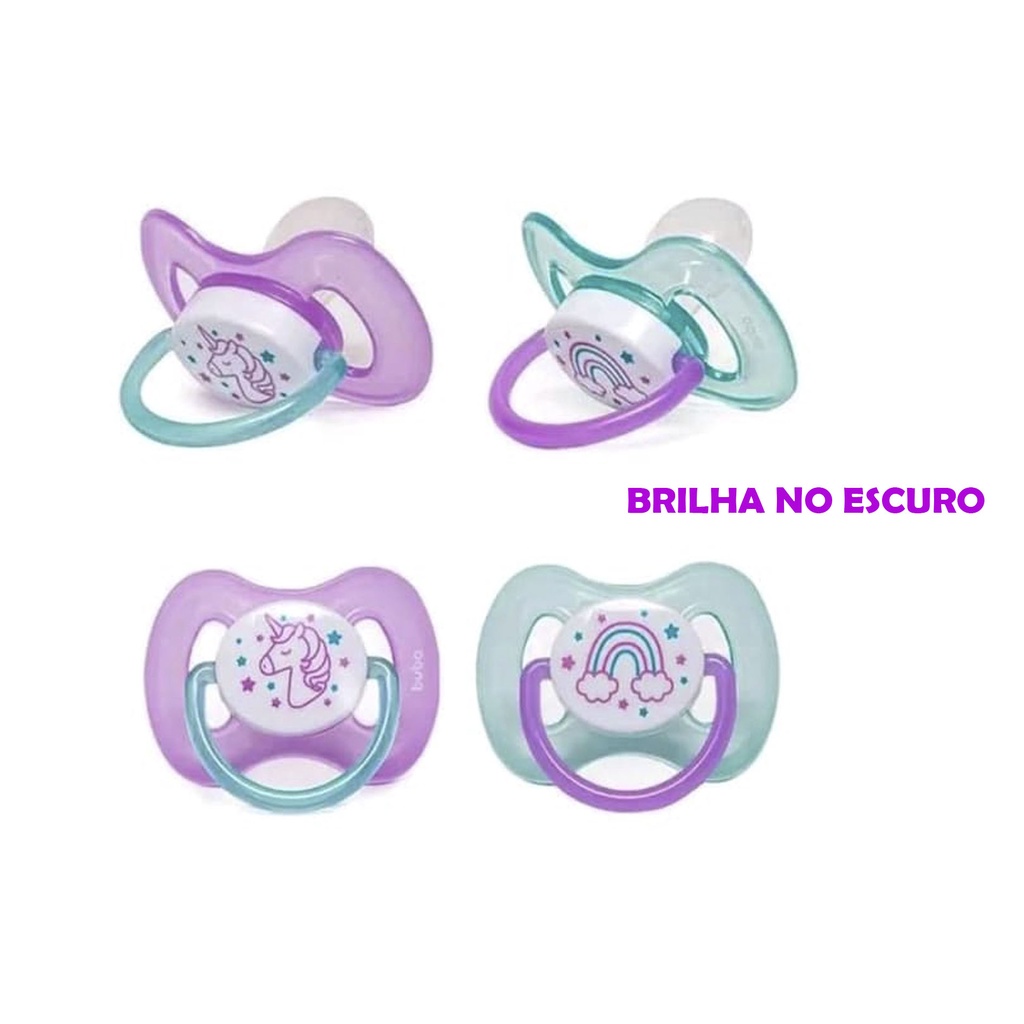 Kit duas chupeta Bico Silicone Brilha No Escuro Buba Menino e Menina