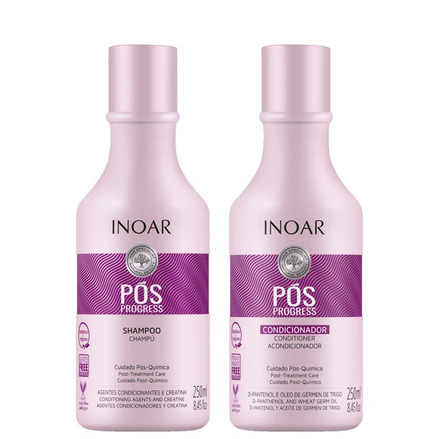 Kit Duo Inoar Pós Progress 250ml Kit para manutenção de cabelos com escova progressiva. Diminui o frizz e evita o ressecamento das pontas. Contém: Inoar Pós Progress Shampoo (low poo) - 250ml Inoar Pós Progress Condicionador (noo poo co-wash) - 250ml Produto vegano. Não testado em animais. Ação: Sua fórmula combina poderosos ativos de alta tecnologia com a Nano Sericina, que proporciona a nano-recuperação dos fios danificados e da massa proteica, e D-Pantenol, que reduz a formação de pontas duplas, deixando o seu cabelo lindo e liso por mais tempo. Como Usar: 1 - Aplique o shampoo nos cabelos molhados massageando suavemente. Em seguida, enxágue completamente. Repita a operação, se necessário. 2 - Retire o excesso de água dos cabelos pressionando suavemente os fios com uma toalha. 3 - Distribua o condicionador no comprimento e pontas dos fios. Massageie suavemente e deixe agir por alguns instantes. 4 - Retire o excesso de água dos cabelos pressionando suavemente os fios com uma toalha.