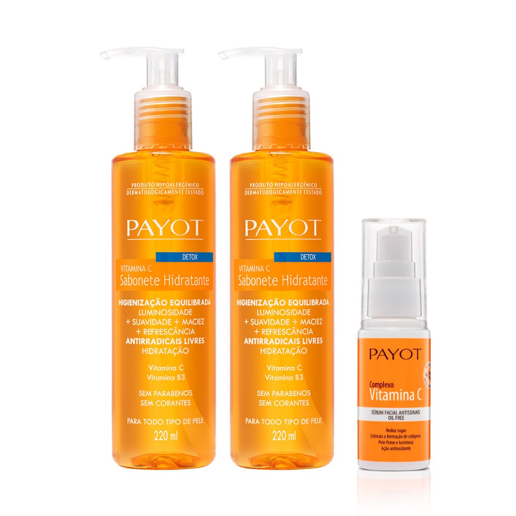 Kit Duo Limpeza Vitamina C + Tratamento Complexo Vit C, contém: 2- Sabonete líquido detox vitamina c payot 220mlAção ou benefício: proporciona higienização equilibrada, desintoxicante, trazendo luminosidade, suavidade, maciez e refrescância. 1- Sérum Complexo de Vitamina C Payot 30ml Ação ou benefício: com o complexo de vitamina c, de payot, a sua pele torna-se lisa, firme e luminosa!