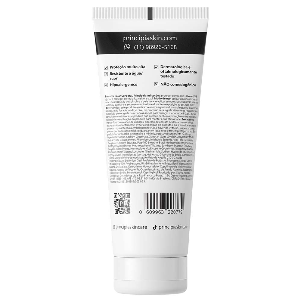 Kit Dupla Proteção Corporal com protetor solar corporal fluido antioleosidade com 24% de filtros UV e 2% de niacinamida, FPS 45, toque seco e eficácia contra raios UVA e UVB + protetor solar corporal fluido antioleosidade com 29% de filtros UV e 2% de niacinamida, FPS 60, toque seco e eficácia contra raios UVA e UVB. Indicações Principais » Proteger contra o sol » Auxiliar na proteção contra a luz visível e luz azul » Controlar a oleosidade » Promover hidratação » Reduzir e uniformizar a pigmentação Tipos de pele » Todos MODO DE USO » Use diariamente antes da exposição ao sol » Aplique abundantemente sobre a pele seca » Reaplique sempre após sudorese intensa, nadar ou banhar-se, secar-se com toalha e durante a exposição ao sol » Mantenha fora do alcance de crianças » Em caso de contato acidental com os olhos, enxaguar abundantemente » Havendo irritação, suspenda o uso e procure por orientação médica INGREDIENTES ATIVOS NIACINAMIDA Forma estável de vitamina B3 capaz de entregar diversos benefícios para a pele, tais como redução de acnes e cravos e controle da oleosidade, comprovados em estudos publicados em diversos médico-científicos. É um precursora dos cofatores NADH (nicotinamida e adenina dinucleotídeo) e NADPH (fosfato de nicotinamida e adenina dinucleotídeo), que em suas formas reduzidas agem como coenzimas em dezenas de reações bioquímicas. FILTROS UV Ingredientes que absorvem ou refletem raios UVA e UVB protegendo a pele contra danos causados pela exposição ao sol tais como aparecimento de manchas, queimaduras solares, envelhecimento prematuro e câncer de pele. DÚVIDAS FREQUENTES Contém parabenos, petrolatos ou silicones? Não. Sua composição também não inclui corantes, fragrância nem glúten. Está regularizada na Anvisa? Sim, conforme o processo número 25351.803889/2023-25. Causa descamação da pele? Em geral, não provoca descamação visível da pele. Foi testada em animais? Não. A PRINCIPIA não realiza testes em animais. Qual o prazo de validade? Três anos, contados da data de fabricação. Pode ser usada junto com outras fórmulas? Sim. Praticamente não há restrições para uso conjunto com outros ativos. Causa acnes ou cravos? Não. Pelo contrário, costuma ter efeito benéfico e ser recomandada para peles acnêicas.