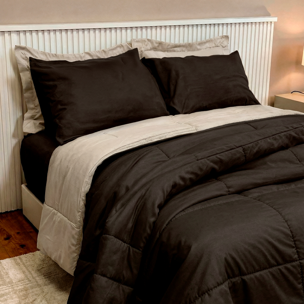 Kit Edredom Colcha Casal Queen 06 Peças Dupla Face Super Macio Mais 2 Travesseiros 200 Fios Percal Hipoalérgico Transforme suas noites em uma experiência de conforto e bem-estar com o Edredom Colcha Casal Super Macio Premium Aconchego Dupla Face 06 Peças Casal Queen Casa Dona Mais 2 Travesseiros! Produzido com materiais de alta qualidade e acabamento impecável, este conjunto oferece um toque macio e envolvente, proporcionando noites mais quentinhas e relaxantes. O design dupla face permite variar a decoração do quarto com praticidade, enquanto as 8 peças garantem um visual harmonioso, sofisticado e funcional. Ideal para quem valoriza conforto, beleza e praticidade no dia a dia, o Edredom Super Macio Aconchego Casa Dona é a escolha perfeita para deixar sua cama com aparência de hotel e transformar o descanso em um verdadeiro momento de prazer. Diferenciais: Toque macio e agradável Dupla face: Sim Tecido leve, de fácil manutenção e secagem rápida Ideal para noites mais frias, com excelente conforto térmico Design moderno e sofisticado Especificações Técnicas: Edredom Colcha Dupla Face Casal Queen: 2,40m x 2,20m Porta Travesseiro: 70cm x 50cm Fronhas: 70cm x 50cm Tecido: Microfibra de alta qualidade Composição: 100% Poliéster Marca: Casa Dona. Modelo do Travesseiro: Percal. Formato de travesseiro: Comprimento x Altura x Espessura - 70 x 50 Centímetros. Material do Tecido do Travesseiro: 100% Poliéster. Composição do Enchimento do Travesseiro: Fibra siliconada. Tipo de fibra do Travesseiro: Siliconada. Perfil: Travesseiro Extra macio. Cuidados na Lavagem: Não utilizar alvejante. Ao lavar na máquina, usar programa delicado. Secar à sombra. Não lavar a seco Itens Inclusos: 01 Edredom Dupla Face Casal Queen (2,40m x 2,20m) 01 Lençol de Baixo com Elástico (para colchão de 1,98m x 1,58m x 30cm de altura) 02 Porta-Travesseiros (70cm x 50cm) 02 Fronhas (70cm x 50cm) 02 Travesseiros 200 Fios Percal Hipoalérgico Observações Importantes: As imagens são ilustrativas. Pode haver variação de cor conforme o brilho e contraste do monitor. Os objetos de decoração não acompanham o produto.