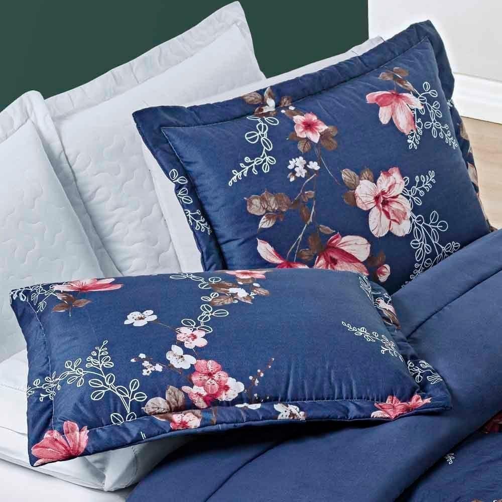 Kit Edredom Celi Queen Dupla Face Micropercal 200 Fios 3 Peças - Azul Marinho Floral