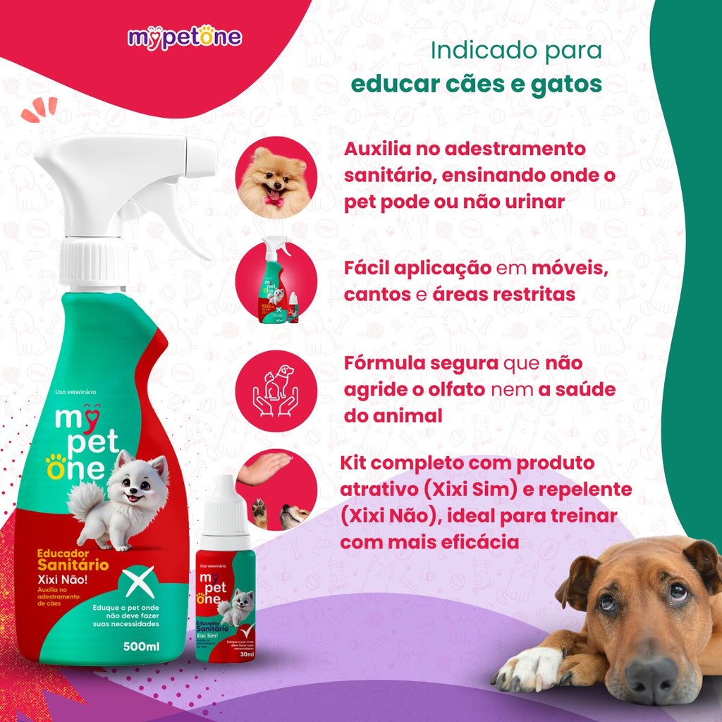 Kit Educador Sanitário Xixi Sim + Xixi Não Mypetone - Facilidade e comodidade na convivência com o seu melhor amigo; - Não mancha os objetos que o liquido entra em contato; - Auxilia o pet a realizar o xixi no local que você desejar; - Não prejudica olfato ou a saúde do seu pet; - Ajuda a educar o pet sem estresse; - Não tem odor para os humanos. Detalhes O Kit Xixi Sim + Xixi Não Mypetone são produtos indicados para auxiliar no adestramento sanitário para cães. Impedindo que seu pet, faça xixi em locais indesejáveis para você. Dicas Especiais Antes de aplicar o Educador Sanitário Xixi Não, certifique-se que o local esteja limpo e sem cheiro. Aplique o produto diretamente no local desejado por meio de pulverização a uma distância de aproximadamente 30cm. O produto pode ser aplicado em locais como: sofá, rodapé, mesas, roda de carro e diversos outros locais com a finalidade de repelir o pet. Para um melhor resultado, aplique 3 vezes ao dia na primeira semana e uma vez ao dia nos demais dias. Pingue 05 gotas do Educador Sanitário Xixi Sim diariamente em uma folha de jornal, em um tapete higiênico ou num pano com o qual tenha a urinar o animalzinho e coloque em um lugar de sua preferência. após alimentar o animalzinho, leve-o para o local desejado, deixando que o cheire. sendo necessário, insista por algumas vezes, pois logo o animalzinho aprenderá o ensinamento e passará a fazer ali suas necessidades. quando se acostumar com o local escolhido, passe a pingar o produto uma vez por semana de forma contínua e ininterrupta. a interrupção da aplicação do produto acarretará a desobediência do animalzinho. Indicação: Cachorros, Gatos Porte/Raça: Raças Pequenas, Raças Médias, Raças Grandes Idade: Filhotes, Adultos, Idosos Composição: Educador Xixi Não: Água, fragrância espanta pet, bronopol e metilcloroisotiazolinona e metilisotiazolinona. Educador Xixi Sim: Uréia, Carbonato de Amônio. Apresentação: Kit Contendo: 500mL + 30mL