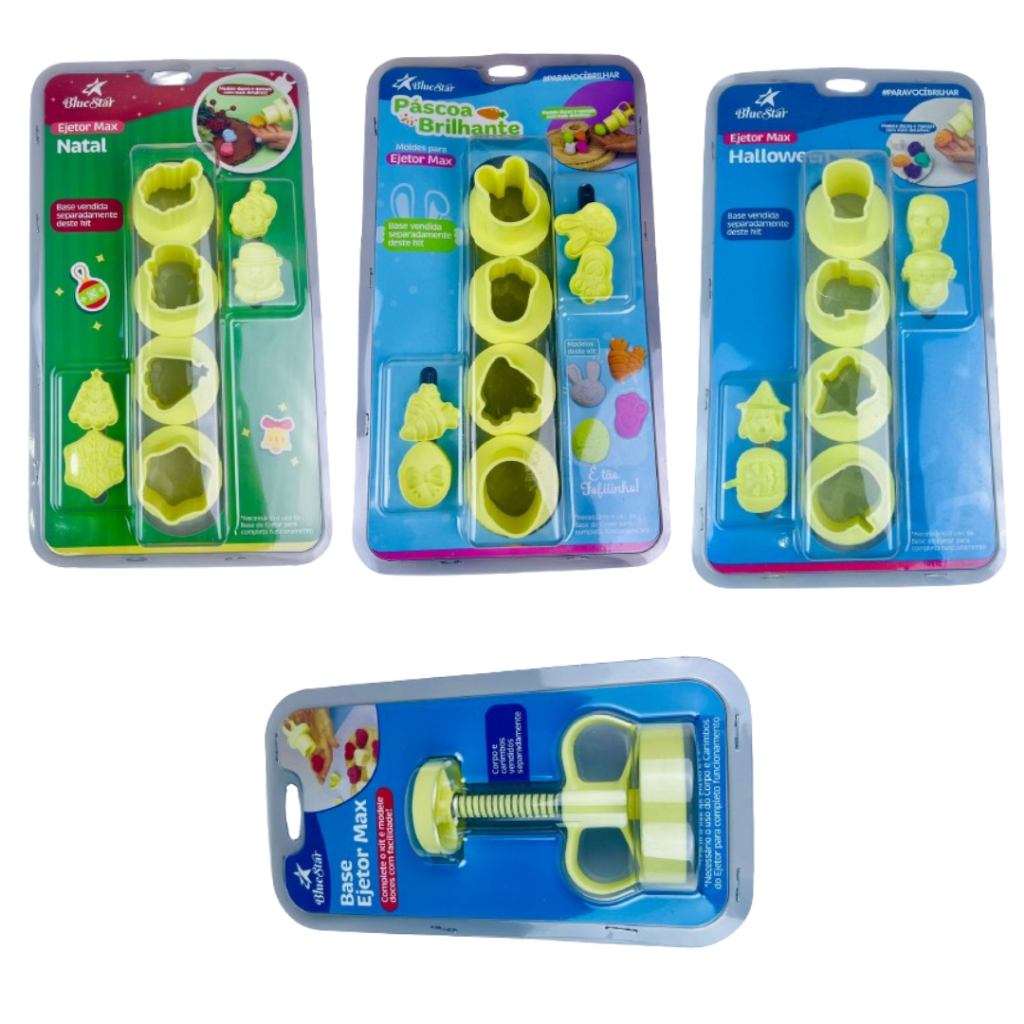 Kit Ejetor Molde Para Massas Brigadeiro e Doces Blue Star Max Flor Coração Arabesco Docinhos Gourmet. NÃO ACOMPANHA A BASE!!!!!! O Kit Ejetor Max é perfeito para auxiliar na decoração de suas produções! As aplicações ficarão perfeitas e padronizadas: todas do mesmo tamanho. Utilize para pasta americana, pasta de açúcar, massa de leite em pó, além de também poder ser utilizado no artesanato: em porcelana fria, argila, massa de modelar, massa de EVA, biscuit e muito mais. Ideal para decorar bolos, tortas, cupcakes, donnuts, lembrancinhas e decoração em geral. Modo de usar: Encaixe a base na estrutura rosqueando. Em seguida, encaixe o marcador escolhido virando levemente para os lados, para travar. Coloque a massa a ser utilizada no ejetor e pressione sobre uma superfície reta para marcar. Ejete para retirar e veja sua linda produção! Após o uso, lave em água corrente com o lado macio da esponja e detergente neutro.