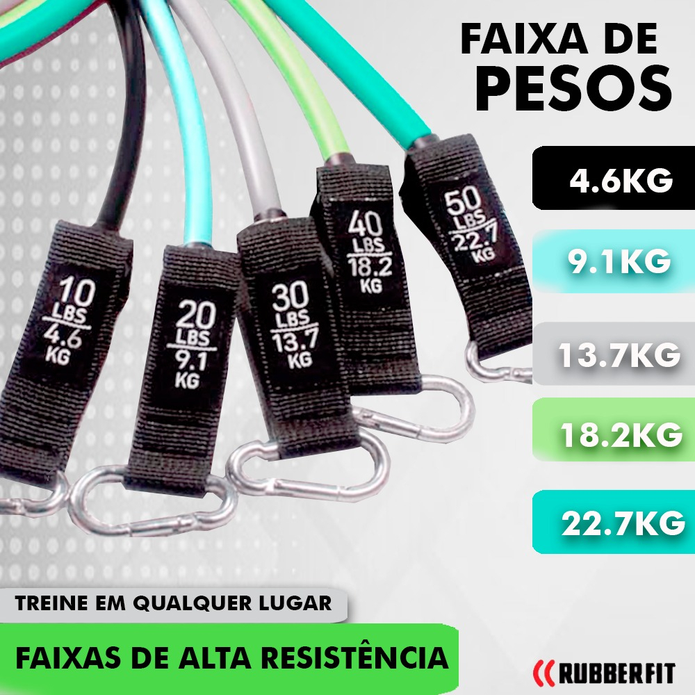Quer praticar seus treinos de musculação sem precisar sair de casa? Levar sua academia portátil onde quer que você vá? Com o kit Rubber Fit você pode praticar seus exercícios em qualquer hora e qualquer lugar, muito prático e compacto! O kit Rubber Fit modelo Premium possui maiores cargas que os demais, são 68kg para treinos mais intensos. Cores exclusivas! Último lançamento. Elásticos de alta resistência e acabamento reforçado. Equipamento mais seguro. Alguns benefícios dos exercícios feitos com o Kit Elástico Extensor: Auxilia no ganho e manutenção da massa muscular. Também pode aumentar sua resistência, resultando em consistentes melhoras no condicionamento físico e diminuindo as chances de lesões. Como todo exercício físico: mantém o corpo saudável, reduz os níveis de stress e melhora o sono. Perfeito para Musculação, Treinamento Funcional, Yoga e Pilates Especificações: Elásticos feitos de borracha profissional de alta qualidade e resistência. Cada elástico tem 1,20m de comprimento. Você pode criar mais de 30 diferentes combinações de níveis de resistência/carga, utilizando 1, 2, 3, 4 ou 5 elásticos de uma vez. O kit Inclui: 1 elástico preto (4,6kg) 1 elástico azul claro (9,1kg) 1 elástico cinza (13,7kg) 1 elástico verde claro (18,2kg) 1 elástico verde (22,7kg) 2 alças pegadores revestidos de espuma 2 tiras de tornozelos 1 âncora para travar na porta 1 bolsa de transporte em nylon 1 manual de exercícios (brinde) Produto com nota fiscal e garantia. Garantia do vendedor: 1 meses
