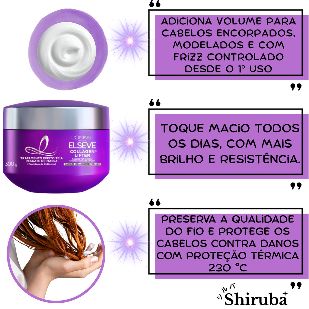 É um prazer tê-lo(a) como nosso(a) cliente! Kit L'Oréal Paris Elseve Collagen Lifter – Volume, Densidade e Força | Rotina Completa para Cabelos Finos e Fragilizados Cabelos finos, afinados e fragilizados tendem a perder densidade, volume e resistência ao longo do tempo. Pensando nisso, a linha Elseve Collagen Lifter foi desenvolvida para ajudar a encorpar os fios, devolver massa capilar e proporcionar um visual mais cheio e saudável, sem pesar. O Kit Elseve Collagen Lifter reúne uma rotina completa de cuidados que atua desde a limpeza até a finalização, fortalecendo a fibra capilar e ajudando a reconstruir a massa dos fios. Sua fórmula com peptídeos de colágeno auxilia na estrutura capilar, promovendo fios mais densos, resistentes e com movimento natural desde as primeiras aplicações. Imagine seus cabelos com mais corpo, leveza e aparência de fios mais cheios. Com o uso contínuo da linha, os cabelos ficam visivelmente mais encorpados, fortes e saudáveis, sem aspecto pesado ou oleoso. **Conteúdo do Kit** • 1 Shampoo Encorpador Elseve Collagen Lifter – 200ml • 1 Condicionador Redensifica Fios Elseve Collagen Lifter – 200ml • 1 Tratamento Efeito Teia Resgate de Massa Elseve Collagen Lifter – 300g • 1 Leave-In Injeção de Massa Elseve Collagen Lifter – 100ml **Características e Benefícios** • Fórmula com peptídeos de colágeno • Ajuda a reconstruir a massa capilar • Fios mais encorpados e com maior densidade • Sensação de cabelos mais fortes e volumosos • Volume natural sem pesar • Toque leve e movimento natural • Fortalecimento da fibra capilar • Resultado visível desde as primeiras aplicações **Indicação** • Cabelos finos • Cabelos afinados • Cabelos fragilizados • Ideal para quem busca mais volume e densidade capilar **Modo de Uso** **1° Passo: Shampoo Encorpador** • Aplique nos cabelos molhados • Massageie suavemente o couro cabeludo • Enxágue bem • Repita se necessário **2° Passo: Máscara Tratamento Efeito Teia** • Com os cabelos úmidos, aplique uma quantidade generosa nas mãos • Pressione uma mão contra a outra para ativar o efeito teia • Distribua no comprimento dos fios • Deixe agir por 5 minutos • Enxágue bem **3° Passo: Condicionador Redensifica Fios** • Aplique no comprimento e nas pontas • Deixe agir por alguns instantes • Enxágue abundantemente **4° Passo: Leave-In Injeção de Massa** • Aplique nos cabelos molhados ou secos • Pode ser usado antes da escova ou como finalizador • Não enxágue Com o uso contínuo da linha Elseve Collagen Lifter, os fios ficam mais encorpados, resistentes e com aparência de cabelo mais cheio e saudável. Garanta agora o seu kit e devolva volume, força e vitalidade aos seus cabelos! Agradecemos por escolher a Loja Shiruba e por confiar em nós para cuidar da beleza dos seus cabelos. Em caso de dúvidas, estamos à disposição para ajudar!