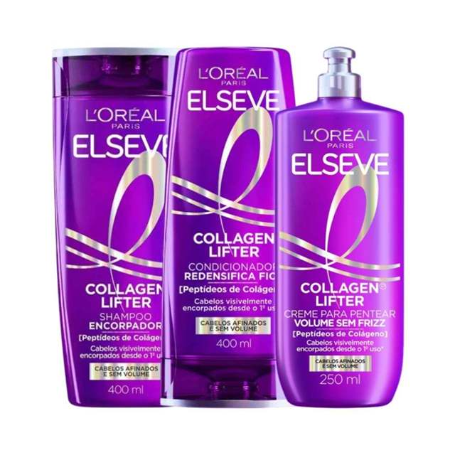 Kit Contém: Shampoo Elseve Collagen Lifter 400ml – promove uma limpeza eficaz e equilibrada, removendo impurezas sem ressecar os fios e preparando-os para receber os cuidados nutritivos. Condicionador Elseve Collagen Lifter 400ml – complementa o shampoo com ação desembaraçante e nutritiva, selando a cutícula e deixando os fios mais fáceis de pentear, suaves e com brilho natural. Creme de Pentear Elseve Collagen Lifter 250ml – finalizador que facilita o desembaraço, nutre profundamente e ajuda a controlar o frizz, proporcionando toque sedoso, movimento natural e visual alinhado. Esse kit é ideal para quem deseja resultado de salão em casa, com cabelos mais fortes, resistentes à quebra, fáceis de manejar e com acabamento profissionais no dia a dia. Modo de Uso: 1) Shampoo Elseve Collagen LifterAplique nos cabelos molhados, massageando suavemente o couro cabeludo até formar espuma. Enxágue completamente. Reaplique se necessário. 2) Condicionador Elseve Collagen LifterApós o shampoo, aplique o condicionador nos cabelos úmidos, do comprimento às pontas. Massageie levemente e deixe agir por alguns instantes. Enxágue completamente. 3) Creme de Pentear Elseve Collagen LifterCom os cabelos limpos e úmidos, aplique o creme de pentear ao longo do comprimento e pontas. Penteie suavemente e finalize como desejar. Não enxaguar.