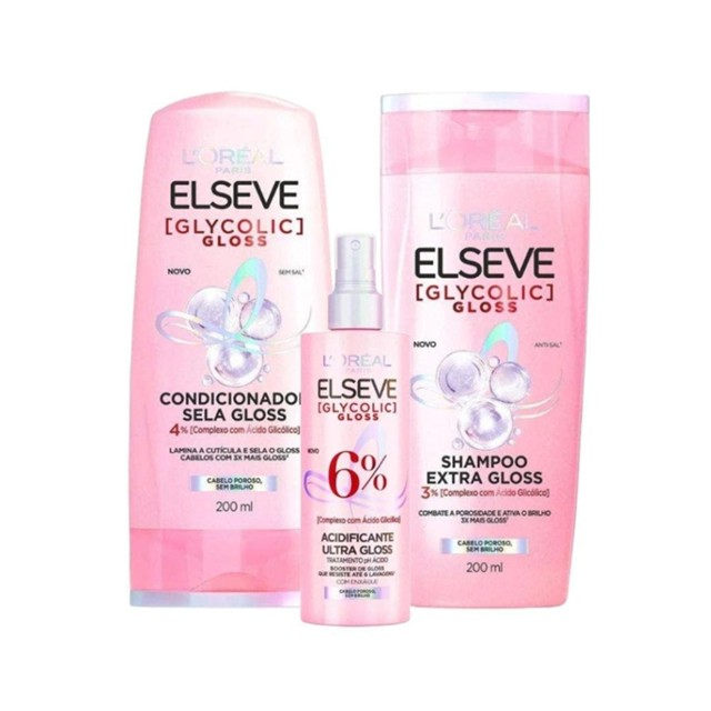 Kit Contém:-Shampoo Elseve Glycolic Gloss 200ml -Condicionador Elseve Glycolic Gloss 200ml -Creme para Pentear Elseve Glycolic Gloss 250ml Shampoo Elseve Glycolic Gloss 200ml -Shampoo para todos os tipos de cabelos. Elseve L’Oréal Paris Glycolic Gloss realiza uma limpeza profunda nos fios enquanto contribui para combater a porosidade. Condicionador Elseve Glycolic Gloss 200ml -Condicionador para todos os tipos de cabelos. Elseve L’Oréal Paris Glycolic Gloss realiza uma desembaraçante ação instantânea, destacando-se por uma abordagem dupla. Spray Acidificante Elseve Glycolic Gloss 200ml -Acidificante para todos os tipos de cabelos. Elseve L’Oréal Paris Glycolic Gloss representa um tratamento ácido que combate eficazmente a porosidade dos fios, proporcionando um impulso de gloss desde a primeira aplicação.