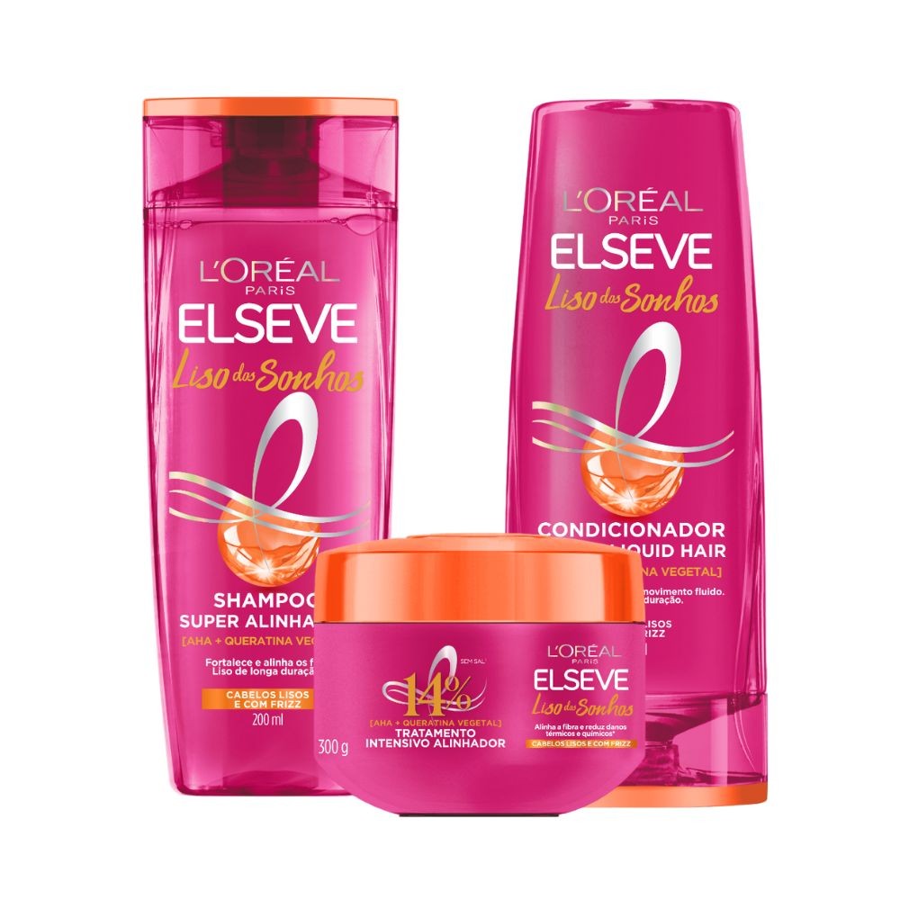 Kit Contém: -Shampoo Elseve Liso Dos Sonhos AHA + Queratina Vegetal 200ml-Condicionador Elseve Liso Dos Sonhos AHA + Queratina Vegetal 200ml -Creme de Tratamendo Elseve Liso Dos Sonhos AHA + Queratina Vegetal 300g Shampoo Elseve Liso Dos Sonhos AHA + Queratina Vegetal 200ml O Shampoo Super Alinhador limpa e fortalece a fibra preparando os fios para um liso de longa duração e com frizz controlado Condicionador Elseve Liso Dos Sonhos AHA + Queratina Vegetal 200ml O Condicionador Efeito Liquid Hair sela e restaura a superfície da fibra para um liso com efeito liquid hair: Desmaiado, com movimento super fluido e brilho intenso. Creme de Tratamendo Elseve Liso Dos Sonhos AHA + Queratina Vegetal 300g Sonhando com um liso de longa duração e frizz controlado? O Tratamento Intensivo Alinhador alinha a fibra sem pesar e reduz danos químicos e térmicos dos cabelos lisos e alisados.