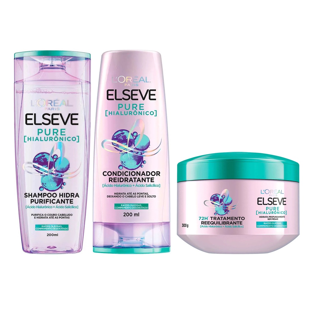 A linha Elseve Pure Hialurônico de L’Oréal Paris purifica as raízes e limpa profundamente a fibra capilar. O Shampoo Hidra Purificante, desenvolvido com a dupla ação do poder de [Ácido hialurônico + Ácido salicílico], é capaz de ao mesmo tempo purificar, controlar a oleosidade nas raízes e hidratar o comprimento até as pontas. O Condicionador Reidratante, desenvolvido com a dupla ação do poder de [Ácido hialurônico + Ácido salicílico], devolve o nível ideal de hidratação do comprimento às pontas para uma transformação instantânea sem pesar. Nossa Máscara Tratamento Reequilibrante 72H , com a combinação de Ácido hialurónico + Ácido salicilico], hidrata intensamente a fibra capilar até as pontas por 72 horas sem pesar. Para um cabelo naturalmente brilhante, suave e cheio de movimento. Tecnologia Ácido salicílico - Remove a oleosidade, impurezas e poluição do couro cabeludo para uma sensação de limpeza duradoura. Ácido hialurônico - Preenche o cabelo Instantaneamente com hidratação profunda som pesar. Benefícios Limpa profundamente para raizes soltas e refrescância. Cabelos saudáveis, macios, leves, soltos e hidratados.