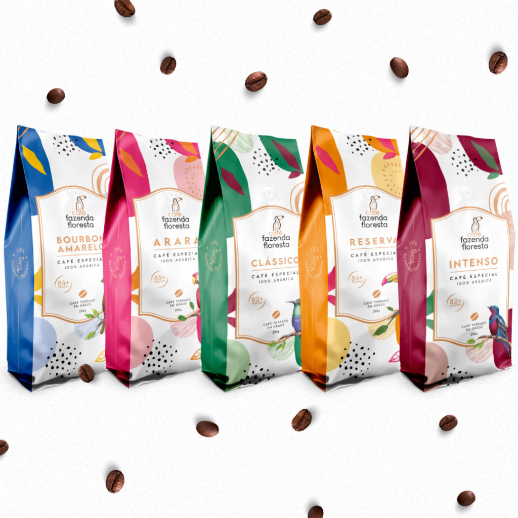 KIT em grãos Café Fazenda Floresta (1 Clássico /1 Reserva /1 Arara /1 Bourbon Amarelo /1 Intenso) 5 pacotes de 250g