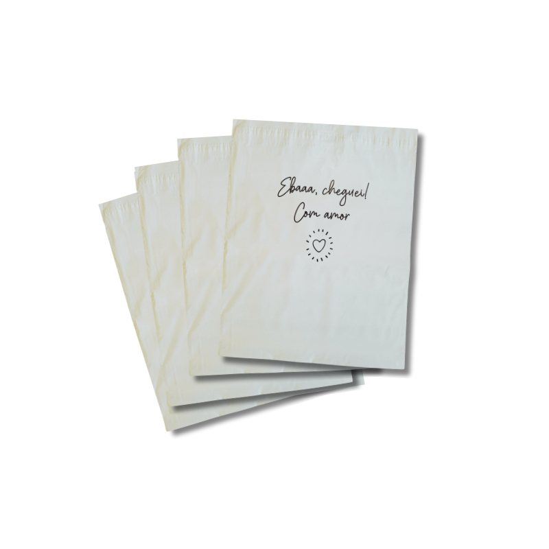 Este modelo específico já está impresso com a frase EBA CHEGUEI, COM AMOR. Tornando a aparência da embalagem muito mais bonita e agradável, ideal para destacar suas encomendas no meio das outras que são transportadas e passando um sentimento de carinho pelo cliente. Envelopes plásticos para envio de roupas, sapatos, eletrônicos em geral e outras infinidades de objetos. Para melhor sigilo do que está sendo transportado, para um menor custo do envio da sua mercadoria, para uma melhor resistência ao rasgo, use nossos envelopes de segurança. Distribuidor oficial de uma empresa com profissionais altamente qualificados e com mais de 15 anos no ramo de envelopes de segurança. Qualidade e preço justo você encontra aqui. Confira abaixo se a medida do envelope serve para o seu produto. O cálculo é: Para calcular o tamanho, meça altura + largura e altura + comprimento. Exemplo: um objeto que tem 15cm de altura x 20cm largura x 30cm de comprimento é só somar a altura mais a largura (15+20 = 35) e altura mais o comprimento (15+30 = 45). Seu produto terá 35x45, porém a embalagem tem que ter mais de 35x45. No caso deste exemplo o tamanho ideal seria o 40x50. Na dúvida informe Altura x largura e comprimento do produto no campo de pergunta Características: - É altamente resistente a rasgos e rupturas; - É leve e diminui o custo do envio em relação à caixas de papelão; - Cola adesiva permanente hotmelt, super resistente; - Nenhuma transparência, sendo assim impossível ver o que está dentro do envelope; - É 100% reciclável. Você está adquirindo o envelope ideal para seu produto. Fique à vontade para tirar suas dúvidas no campo de perguntas.