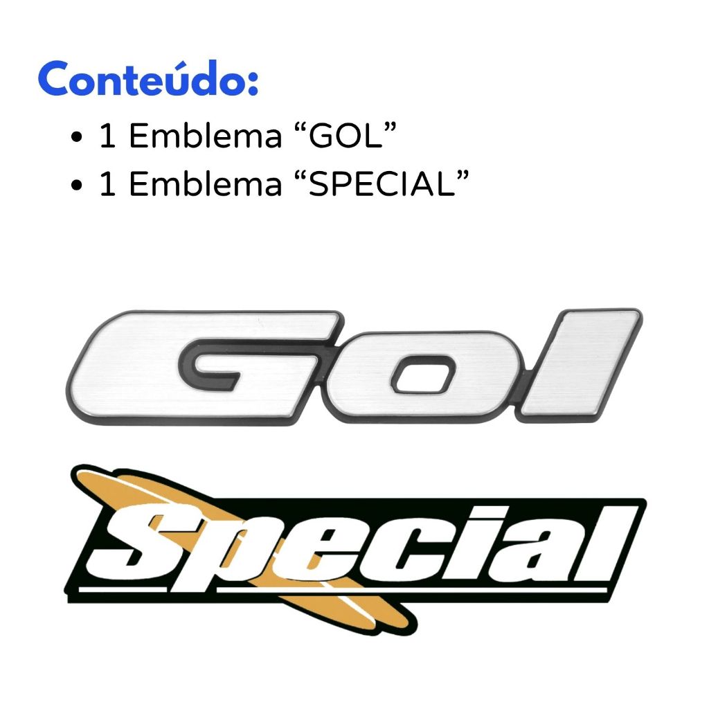 KIT EMBLEMA COMPOSTO POR 02 ITENS, - 01 Emblema “GOL” DA TAMPA TRASEIRA - 01 Emblema adesivo “Special” DA TAMPA TRASEIRA APLICAÇÃO - GOL Special- G2 "BOLA" 1995 a 1999 **OS EMBLEMAS SÃO SIMILARES AOS ORIGINAIS VISANDO MANTER A ORIGINALIDADE DO VEÍCULO, PORÉM NÃO SÃO ORIGINAIS DA MONTADORA** DICAS PARA INSTALAÇÃO: - Os emblemas já vem com fita dupla face; - Limpe bem e remova todas as impurezas na área de aplicação do emblema; Recomendamos que a instalação seja feita sempre por um profissional, não nos responsabilizamos por má instalação. Garantia: 30 Dias da emissão da NF Dúvidas? Manda no chat, estamos disponíveis para lhe atender