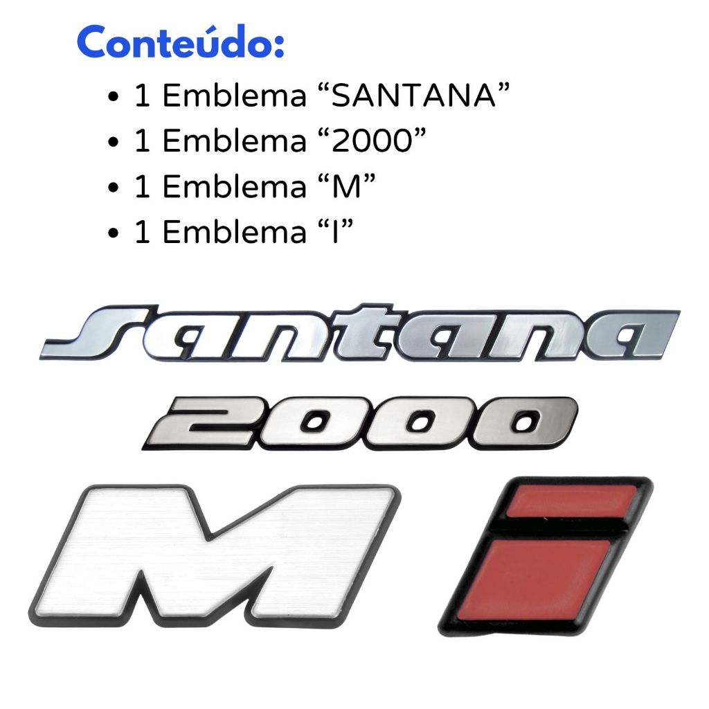 Kit Emblema Volkswagen Santana MI 2000 1991 a 1998 - 4 Peças KIT EMBLEMA COMPOSTO POR 04 ITENS, ABAIXO MEDIDAS APROXIMADAS: - 01 EMBLEMA "SANTANA" DA TAMPA TRASEIRA 7,7 cm x 2,1 cm - 01 EMBLEMA "2000" DA TAMPA TRASEIRA 10,2 cm x 2 cm - 01 EMBLEMA "M" DA TAMPA TRASEIRA 2 cm x 2,3 cm - 01 EMBLEMA “I” DA TAMPA TRASEIRA 7,3 cm x 2,2 cm APLICAÇÃO: - Santana 1991 a 1998 Os emblemas são similares aos originais mantendo a mesma cor, tamanho e material de excelente qualidade visando manter a originalidade do veículo, porém não são originais da montadora. INSTALAÇÃO: Limpe e remova todas as impurezas na área de aplicação do produto Dúvidas, mande na caixinha de perguntas, estamos disponíveis para lhe ajudar. Garantia do vendedor: 30 dias