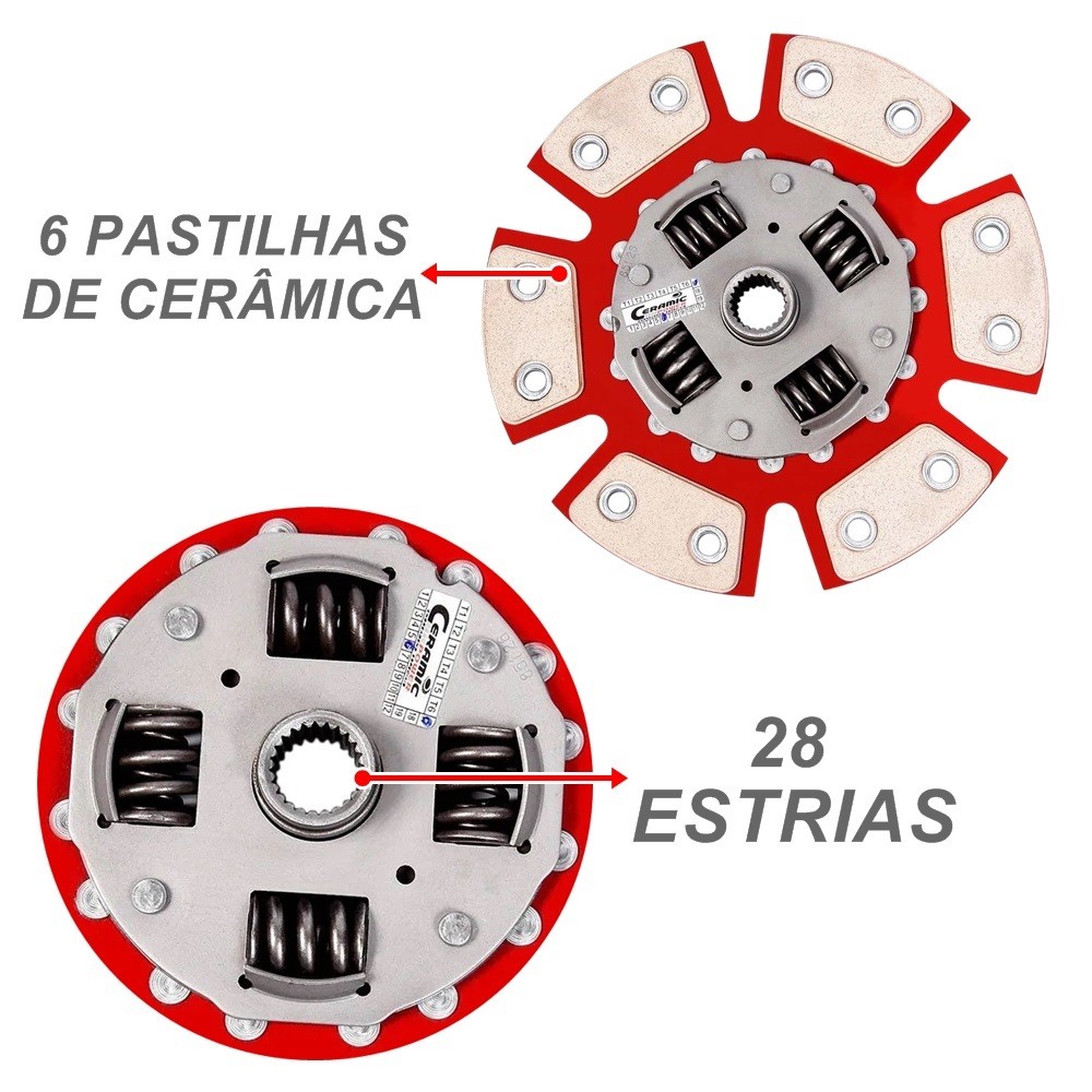 As embreagens especiais Ceramic Power, mais conhecidas como embreagens de cerâmica, são destinadas para carros turbo, nitro e aspirados. Os produtos são desenvolvidos com matéria prima de alta qualidade e rigorosamente testados durante e após o processo de montagem, para garantir o máximo desempenho do carro, seja de rua, arrancada, drift, circuito ou off-road. CARACTERÍSTICAS DO PRODUTO - Uso em rua: Indicado para carros de até 350cv COMPATIBILIDADE DO PRODUTO - Audi A3 1.6 8v (EA111) 100cv - 07/2002 a 2006 - Golf 1.6 8v (EA111) - 02/2001 a 2014 - Polo 1.0 16v - 05/2002 a 12/2003 - Polo 1.6 8v Flex e Gasolina - 05/2002 a 2015 - Gol 1.0 8v G4 G5 G6 (EA111) - 04/2007 a 2016 - Gol 1.6 8v G4 G5 G6 (EA111) - 04/2007 a 2022 ... (em produção) - Saveiro 1.6 8v (EA111) - 04/2007 a 2022 ... (em produção) - Voyage 1.0 8v - 2009 a 2016 - Voyage 1.6 8v (EA111) - 2009 a 2022 ... (em produção) - Fox 1.0 8v (EA111) - 2003 a 2015 - Fox 1.6 8v (EA111) - 2003 a 2022 ... (em produção) - CrossFox 1.6 8v - 2005 a 2015 - SpaceFox 1.6 8v - 2006 a 2019 - Space Cross 1.6 8v - 2012 a 2015 ESPECIFICAÇÕES DO PRODUTO - 200 mm - 28 Estrias ITENS INCLUSOS - 1 Disco de 6 pastilhas de cerâmica com molas - 1 Platô de 980lbs SOBRE NOSSA EMPRESA Nós da Ceramic Power, atuamos há mais de 15 anos no ramo de embreagens de alta performance. A linha é completa, abrange veículos nacionais e importados. Temos como principal objetivo, garantir qualidade e durabilidade aos nossos produtos. DÚVIDAS FREQUENTES Tem nota fiscal? R: Sim, emitimos nota fiscal. Qual prazo de envio? R: Produto a pronta entrega com envio imediato. O produto é bem embalado? R: Sim, seguimos o padrão de embalagens seguras. Tem garantia? R: Sim, 3 meses de garantia de fabricação, entre em contato conosco. Ficou alguma dúvida? Mande sua pergunta que iremos responder o mais breve possível. Atendimento: Seg. a Qua. das 8:00 as 17:00 / Qui. a Sex. das 8:00 as 16:30