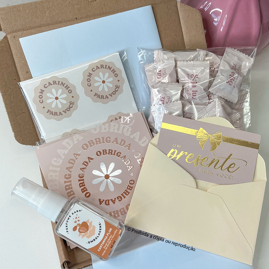 Kit Empreendedora Premium - Agradecimento ao cliente, adesivos, cartão presente, balas e perfume FLOR