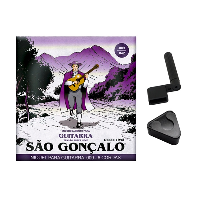 Kit com 1 Encordoamento + 1 Encordoador + 1 Porta Palhetas O Encordoamento São Gonçalo para Guitarra Elétrica é fabricado no Brasil. São acessíveis e proporcionam brilho e qualidade no seu som, principalmente para músicos iniciantes e estudantes. Seu encordoamento é acomodado em embalagem selada para assegurar a originalidade do produto, o que evita falsificações e impede a oxidação dar cordas pelo contato com o oxigênio. Produto Original fornecido pela Izzo Instrumentos Musicais. Tipos de Instrumento onde se pode utilizar: - Guitarra Elétrica 6 Cordas Calibre da Cordas (Bitola/Espessura): - 1 - Mi .009 - 2 - Si .011 - 3 - Sol .016 - 4 - Ré .024 - 5 - Lá .032 - 6 - Mi .042 Características do Produto Material: Níquel Cor: Niquelada O Encordoador Manual à Manivela da Izzo é um acessório prático que facilita a troca de cordas do seu instrumento, tornando essa tarefa mais simples e rápida. Independente do tipo de encordoamento de sua preferência, sendo Aço ou Nylon, essa ferramenta se torna indispensável para o Músico que prima pela qualidade sonora e timbre encorpado de cordas sempre novas. Tipos de Instrumento onde se pode utilizar: - Violão Aço - Violão Nylon - Violão 12 Cordas - Viola Caipira - Cavaquinho - Guitarra - Ukulele Características do Produto Material: ABS Cor: Preto Tipo: Manivela O Porta Palhetas em ABS da Izzo é um acessório prático que armazena suas palhetas possibilitando fácil acesso as mesmas. Item indispensável para Músicos que querem ter suas Palhetas sempre a mão. Tipos de Instrumento onde se pode utilizar: - Violão - Violão 12 Cordas - Viola Caipira - Cavaquinho - Guitarra - Ukulele Características do Produto Material: ABS Cor: Preto Tipo: De Mola Fixação: Fita Dupla Face (inclusa e já aplicada, basta remover a fita protetora e colar no lugar desejado) *É aconselhável colar o produto sempre na paste de trás do instrumento. Itens Inclusos: - 1 Porta Palhetas em ABS da Izzo - 1 Encordoador Manual à Manivela da Izzo - 1 Encordoamentos São Gonçalo para Guitarra Elétrica 009 Tensão Super Leve - 11026 - 1 Nota Fiscal Eletrônica Disponibilidade Imediata