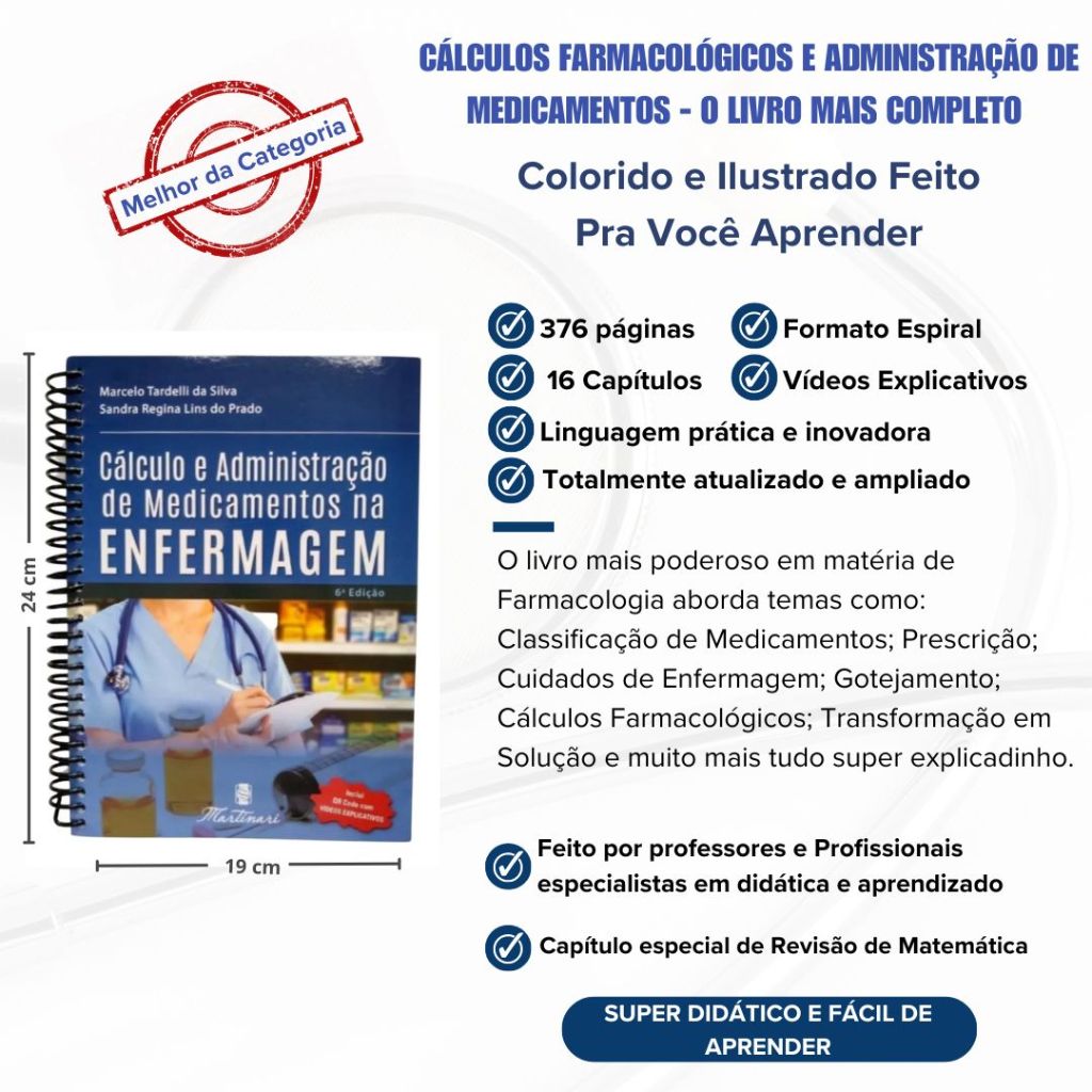 Anuncio Atualizado em 08 de março de 2024. Kit com os dois melhores livros de Enfermagem. Isso mesmo! Você leva os dois melhores e mais vendidos livros de Enfermagem: 01 Manual do Técnico e Auxiliar de Enfermagem (Lançamento com tudo que você precisa saber sobre Enfermagem) + 01 Calculo e Administração de Enfermagem (Atualizado e completo – Fique expert em Farmacologia como ninguém) Livros novos, embalados, com nota fiscal e com o melhor envio do Brasil. Cálculo e Administração de Medicamentos na Enfermagem 6ª Edição ================================================================ Descrição Novidade! Tudo o que você precisa saber sobre Calculo e Administração de Medicamentos em um aversão totalmente atualizada. QR Codes com vídeos exclusivos de procedimentos e explicações. Bulário (Guia de Medicamentos) com nomes dos medicamentos, nome comercial, ação farmacológica, cuidados de enfermagem e muito mais. Formato Espiral para facilitar suas consultas e estudos. Tudo o que você precisa saber sobre Calculo e Administração de Medicamentos em um aversão totalmente atualizada. Este livro foi elaborado com intuito de conduzir e propiciar o aprendizado ao aluno e ao profissional da enfermagem, que buscam conhecimentos e habilidade nos cálculos farmacológicos e no preparo e administração de medicamentos. Serão apresentados os seguintes conteúdos: 1. Legislação no preparo e administração dos medicamentos; 2. Farmacologia; 3. Classificação dos medicamentos; 4. Formas de apresentação dos medicamentos; 5. Prescrição dos medicamentos; 6. Cuidados de enfermagem na leitura da prescrição médica e no preparo de medicamentos; 7. Revisão de matemática; 8. Vias de administração dos medicamentos, cuidados de enfermagem e cálculo para cada via; 9. Cálculos de concentrações dos medicamentos; 10. Transformações de solução; 11. Gotejamento das soluções; 12. Permanganato de potássio (KMnO); 13. Regra de três e diluição de medicamentos; 14. Rediluição de medicamentos para pediatria e neonatologia; 15. Exercícios de fixação de cálculos; 16. Medicamentos: composição, nome comercial, ação farmacológica e cuidados de enfermagem. Glossário Título do livro: Cálculo E Administração Medicamentos Subtítulo: Na Enfermagem Série: Calculo de Enfermagem Autor: Sandra Regina Lins do Prado e Marcelo Tardelli Editora: Martinari Edição: 6 Quantidade de Páginas: 357 Ano de publicação: 2021 Modelo: ESPIRAL Manual Do Técnico E Auxiliar De Enfermagem 4ª Edição ================================================== Nova edição totalmente revisada e ampliada. (2024) O único com 23 capítulos. Adotado em diversas instituições de ensino e o preferido dos professores. Peça já o seu! A Enfermagem é uma profissão que exige dedicação do profissional, uma vez que o cuidar do outro em sua integridade significa não apenas resolver seus problemas físicos, mas também identificar todas as necessidades e buscar formas de atendê-las. Ao técnico e auxiliar de enfermagem compete o cuidado colaborativo dos indivíduos de todas as idades, famílias, grupos e comunidades, doentes ou saudáveis e em todos os ambientes. As suas atribuições vão desde a promoção da saúde e da prevenção de doenças, até o cuidado de pessoas doentes, além do apoio e da promoção de um ambiente seguro. Neste contexto, este livro contempla 23 capítulos que compõem o universo do técnico e auxiliar de enfermagem e possibilitará aos leitores uma visão ampla das principais ações desses profissionais no cuidado com o cliente, família e comunidade. Conheça os nossos 23 capítulos: 1 – Anatomia; 2 – Microbiologia; 3 – Parasitologia; 4 – História da Enfermagem; 5 – Bioética e Ética Profissional; 6 – Norma Regulamentadora nº 32 e sua Aplicabilidade nos Serviços de Enfermagem; 7 – Procedimentos Aplicados a Enfermagem; 8 – Saúde Coletiva; 9 – Farmacologia Aplicada à Enfermagem; 10 – Atendimento Médico-Cirúrgico; 11 - Urgência e Emergência; 12 - Unidade de Terapia Intensiva; 13 – Saúde do Idoso; 14 – Saúde Mental; 15 – Enfermagem em Oncologia; 16 – Central de Material, Centro Cirúrgico e Recuperação Pós-anestésica; 17 – Saúde da Criança; 18 – Saúde da Mulher; 19 – Enfermagem em Doenças Infectocontagiosas; 20 – Administração dos Serviços de Enfermagem; 21 – Aspectos Nutricionais Aplicados no Cuidado de Enfermagem; 22 – Psicologia Aplicada a Enfermagem; 23 - Tecnologia Aplicada a Enfermagem.? Um livro extremamente completo e atualizado e que você precisar ter para se destacar no mercado de trabalho. Formato 17x24cm Lombada 4,5 cm ISBN 9788581160924 Ano 2024 4a Edição Lançamento! Nossa loja está entre uma das melhores da plataforma e sua compra esta totalmente assegurada pela SHOPEE, compre agora mesmo!