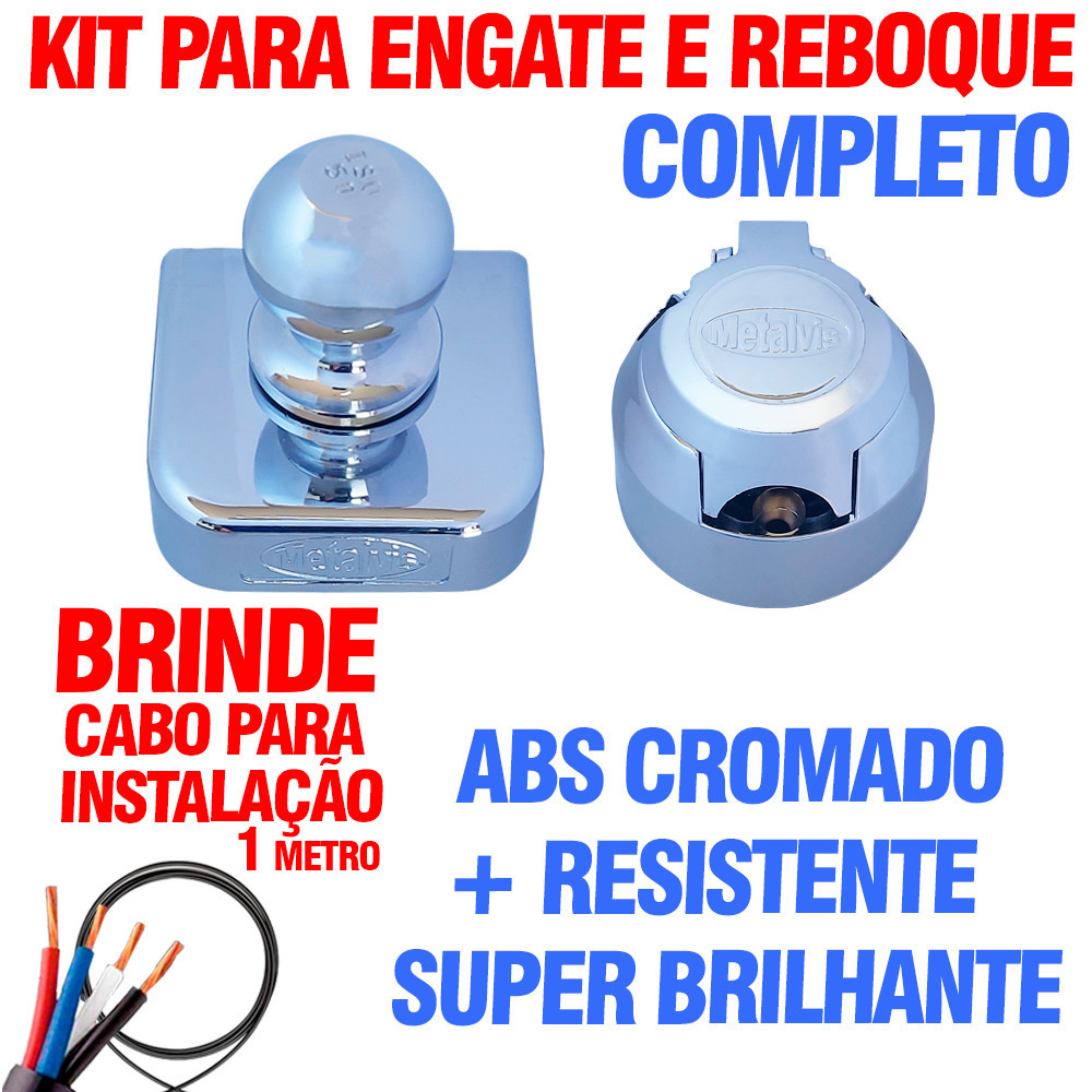 KIT ENGATE REBOQUE CARRETA METALVIS BOLA DE 50MM CAPA 90MM TOMADA 6 POLO CROMADOS CABO BRINDE RGS