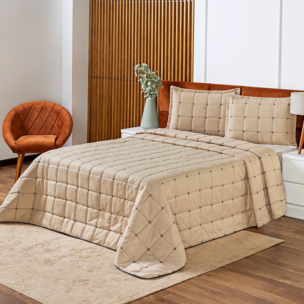 KIT CASAL PADRÃO 3 PEÇAS Contém: 2 Porta Travesseiros 70x50 CM 1 Cobre Leito 2,20x2,40M Composição: Tecido Dupla Face: HiperPercal: 100% Poliéster Enchimento Interno: Manta 100% Poliéster