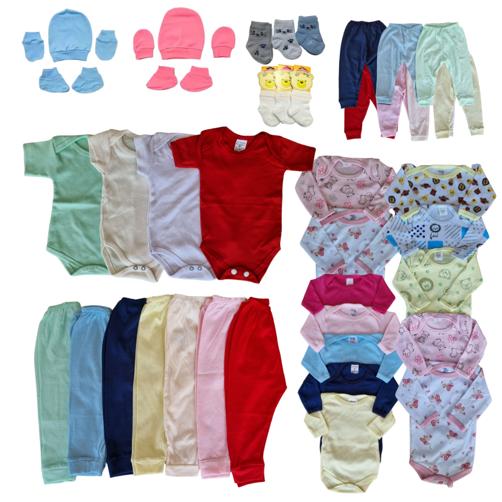 Kit essencial para o dia dia do bebê MEDIDAS P - 0 A 3 MESES M - 3 A 5 MESES G - 5 A 7 MESES Peças em algidão antialérgico o kit acompanha 22 peças sendo: 3 bodies lisos meia manga ou longa 2 bodies estampados meia manga ou longa 5 mijões de malha lisos sem pé 3 kit touca luva e meia (9 peças cada kit tem 3 peças) 3 pares de meias Os itens são enviadas de forma sortida de acordo com a disponibilidade do estoque respeitando o genero escolhido. basta escolher a opção menino para cores de menino, menina para cores de menina e unissex para cores neutras.