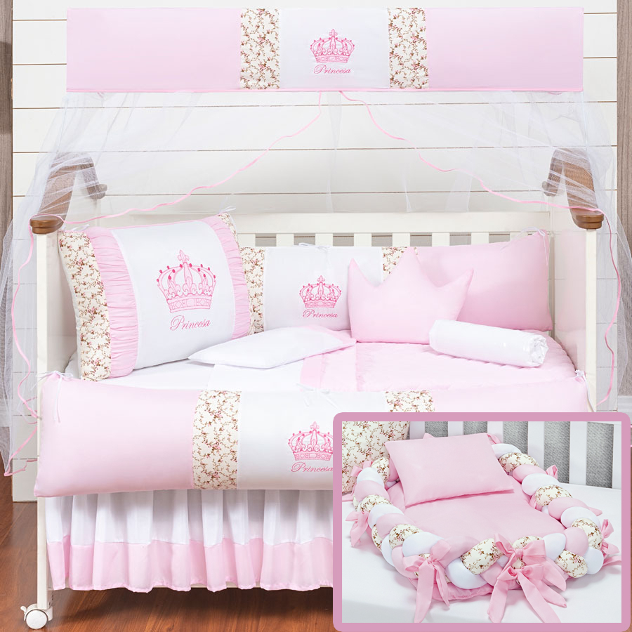 KIT ENXOVAL DE BERÇO COM NINHO REDUTOR 15 PEÇAS TRANÇADO COROA PRINCESA ROSA MODELOS MENINA COROA