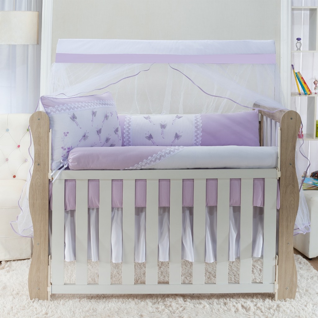 KIT ENXOVAL PARA BERÇO BORBOLETAS LILAS 9 PEÇAS MENINA + SAIA BRANCA