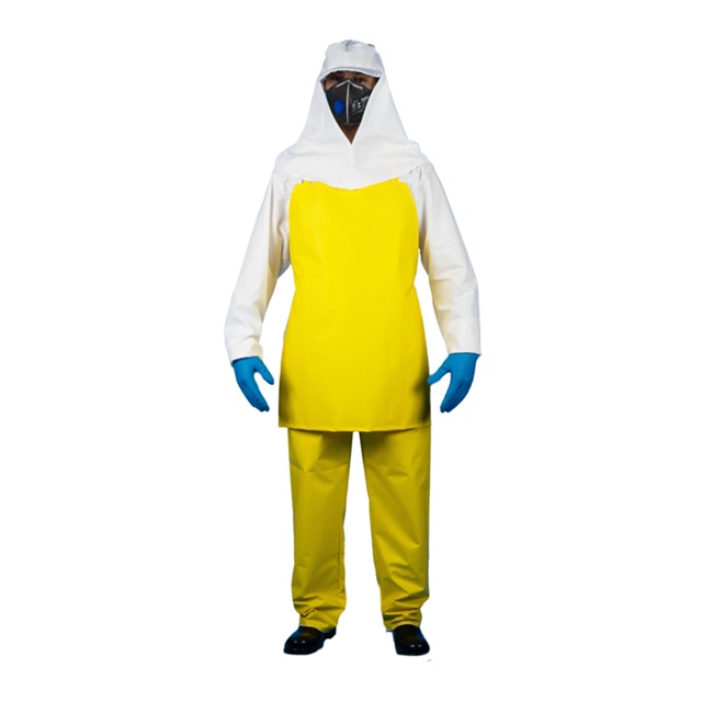 Vestimenta de corpo inteiro, confeccionada em tecido de fios de Poliéster/Algodão, tipo tela, com tratamento hidrorrepelente e material impermeável, tipo Bagum laminado de PVC (Policloreto de Vinila) sobre uma tela de Poliéster. Certificado ISO 27065 Atende a Norma NR-31 Contém: 01 - Touca: Árabe com aba frontal de polietileno rígido revestido com tela hidrorepelente, proteção do pescoço e ombros, com abertura frontal. 01 - Camisa: com mangas compridas até os punhos e cavas retas, gola canoa e elástico na barra. 01 - Calça: comprida até aos pés, tipo reta, com tiras de tecido no cós para ajustes na cintura. E perneiras em PVC (costal), com 70 cm de altura. 01 - Avental: em PVC amarelo com 70 cm de altura por 40 cm de comprimento. *Não acompanha máscara.